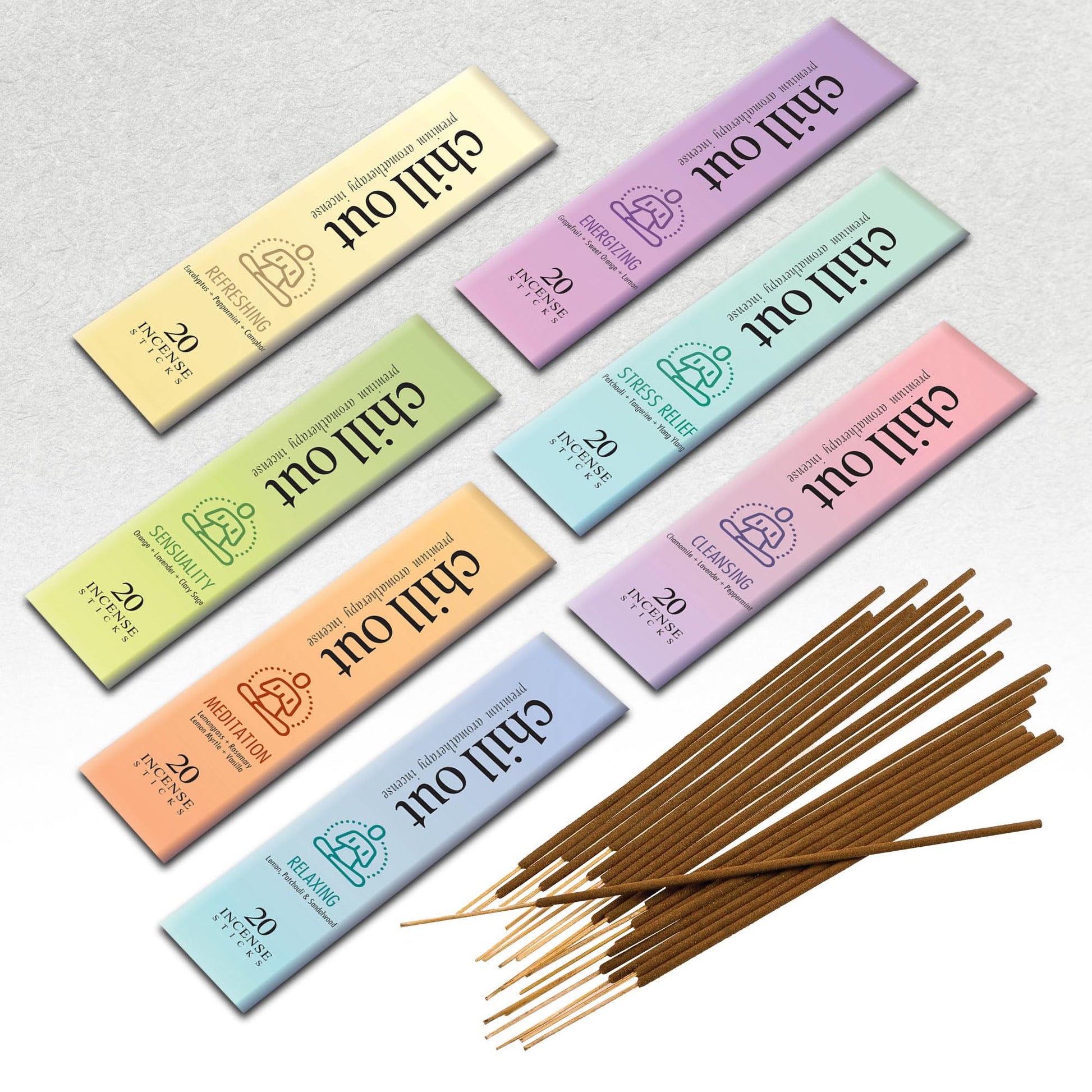 Mecka Chill Out Aromatherapy Incense Sticks Gift Set | Set of 7 Unique Scents- 140 Insence-Sticks for Yoga, Relaxation, Meditation & Positivity | Premium Organic and Slow Burning Insenses