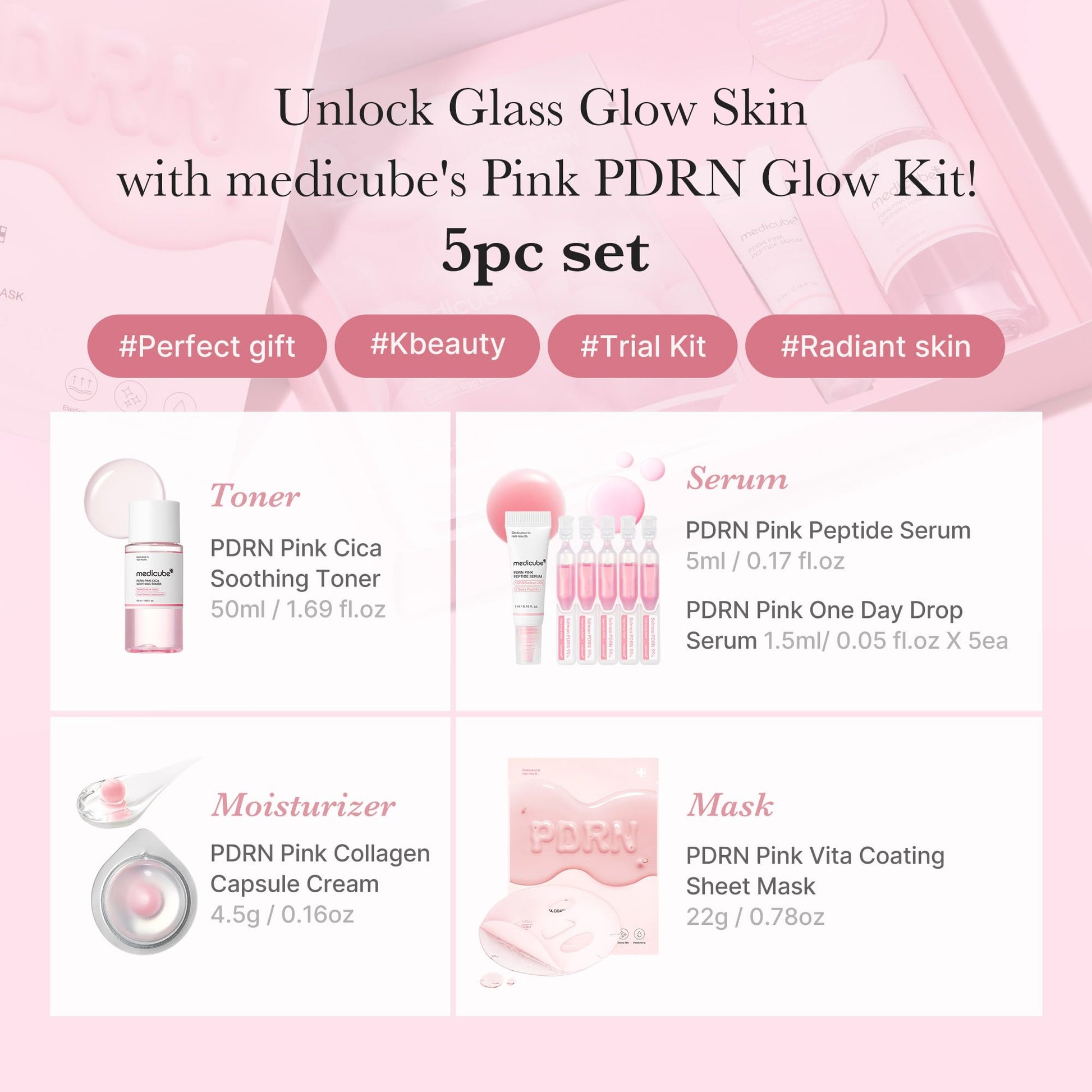 - medicube's Most Loved Pink PDRN Skincare Trial Kit: medicube's best-selling PDRN routine with 5 different mini-sized Pink PDRN products - Facial toner, serum & ampoule, sheet mask - perfect for travel or testing before going full-size.