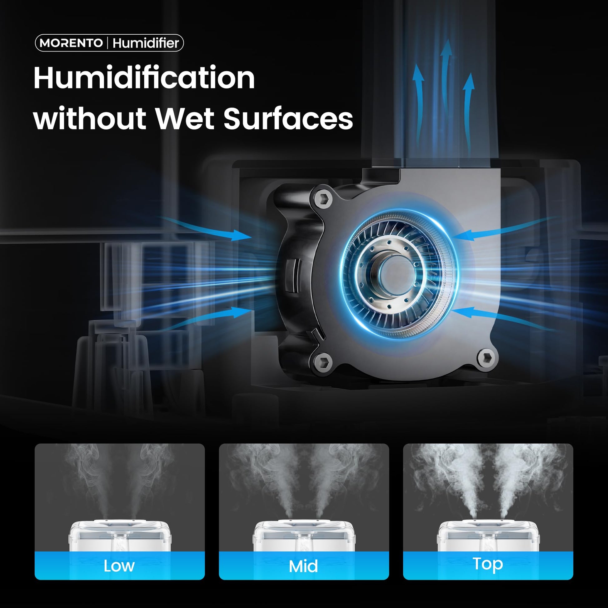 - 6L Large Capacity & Double Nozzle: Enjoy extended use as long as 50H without constant refills thanks to the spacious 6-liter water tank of MORENTO smart humidifiers for bedroom. The innovative double nozzle design provides even distribution, swiftly covering larger rooms and ensuring optimal humidity levels throughout