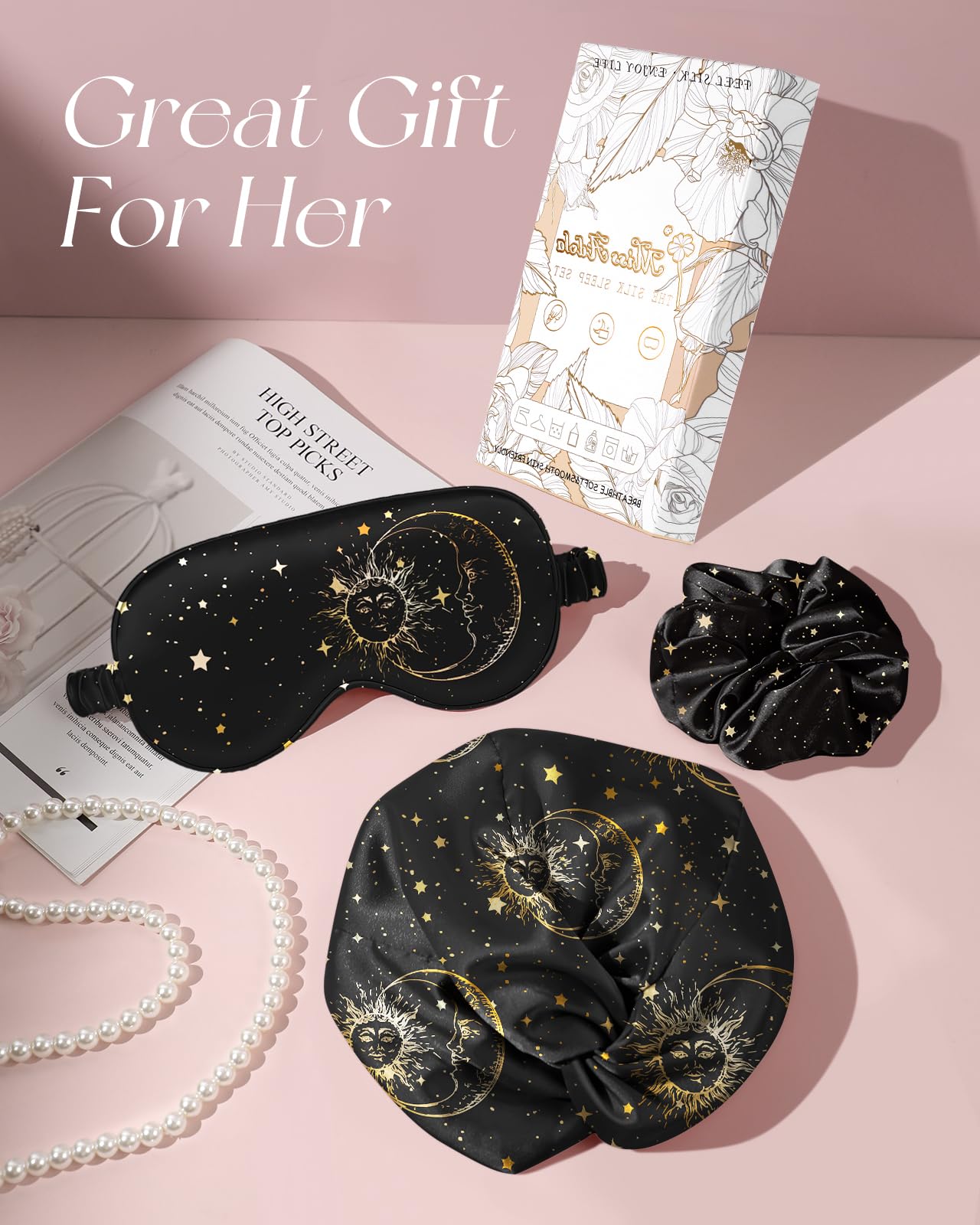 Miss Adola Silk Bonnet for Women - Mulberry Silk Sleep Cap for Hair Care with Eye Mask & Scrunchie 19 Momme Night Cap Sleeping Set with Elastic Stay On Head, Black Sun Moon
