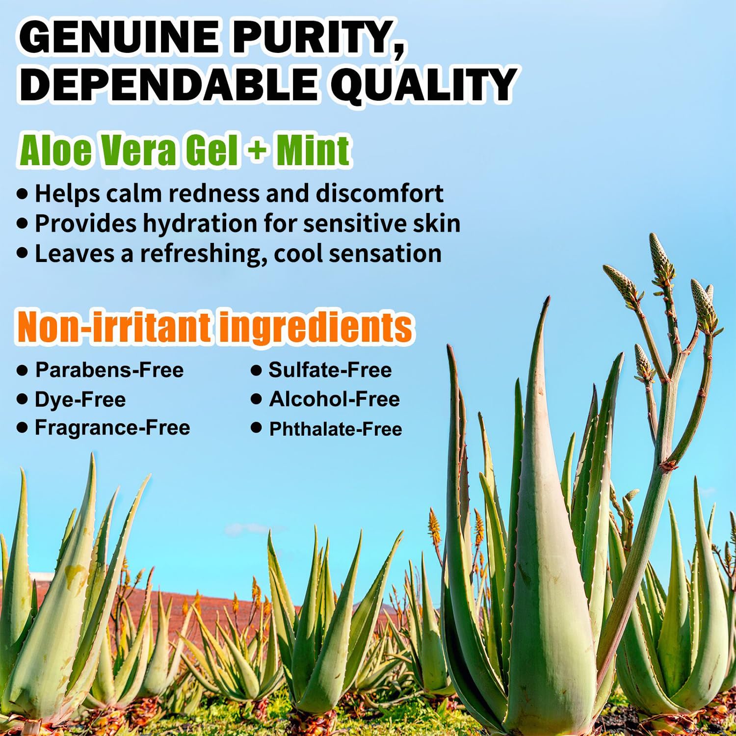 - Genuine Purity, Trusted Quality: Our aloe vera gel is derived from carefully selected aloe plants and rigorously processed to deliver high purity and efficacy. Free from parabens, artificial fragrances, and common irritants, it is formulated to be gentle on sensitive, oily, dry, or combination skin. Infused with mint extract for a refreshing, cooling sensation.