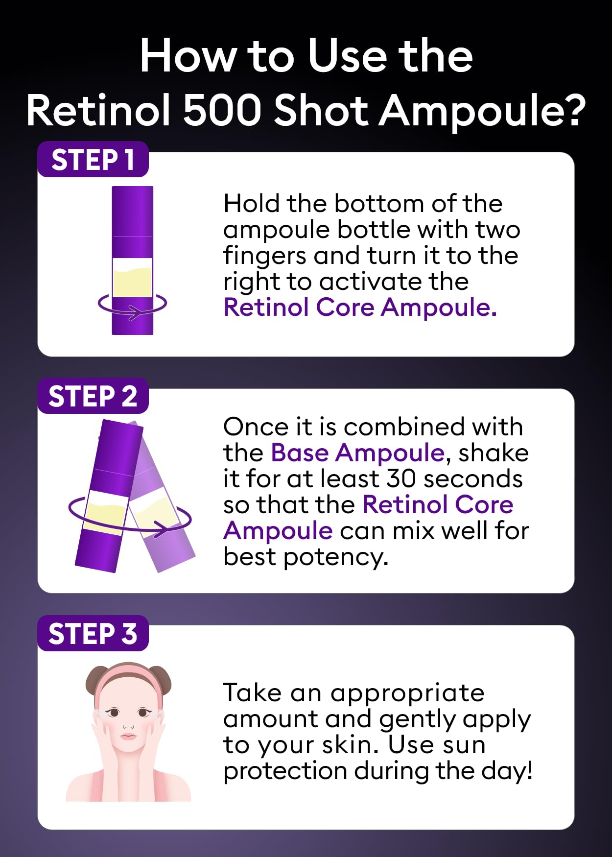- How to Use: Hold the bottom of the ampoule bottle with two fingers and turn it to the right to activate the Retinol Core Ampoule. Shake for at least 30 seconds to ensure thorough mixing. Apply an appropriate amount to your skin, massaging gently. Use sunscreen during the day for protection.