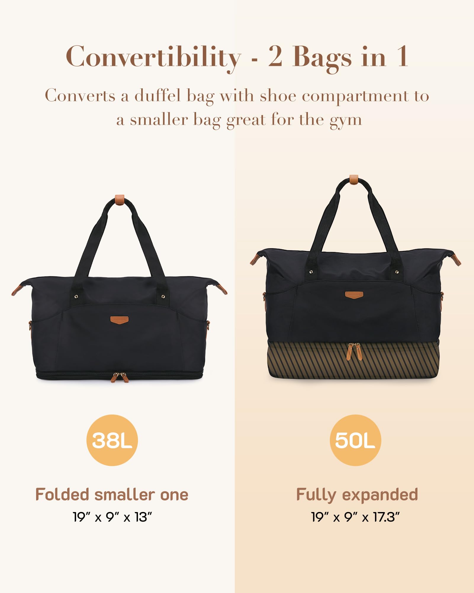 Missnine Weekender Bag for Women, Foldie Travel Bag Expandable with Shoes Compartment Travel Duffel 50L Carry on Overnight Gym