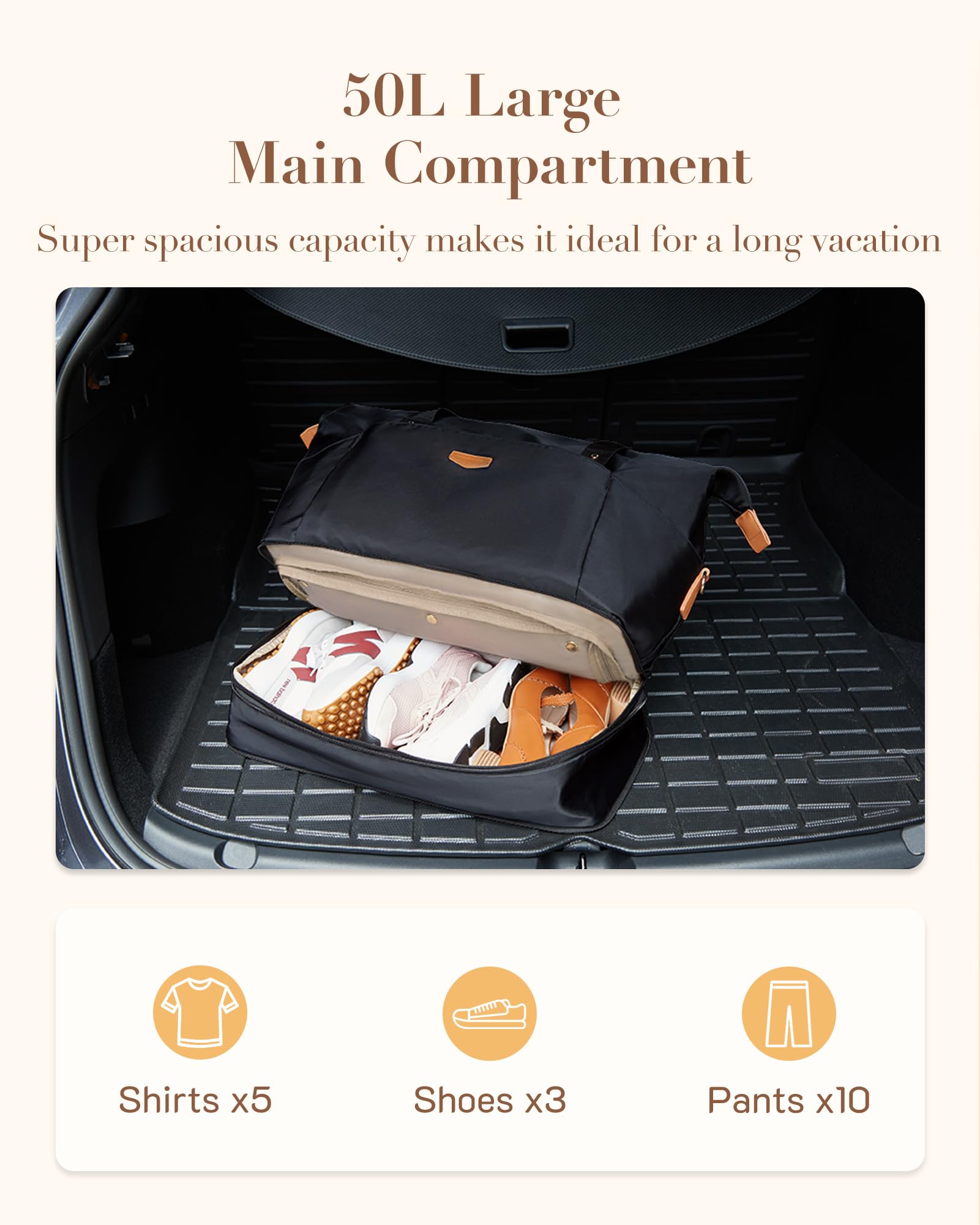 - 50L Roomy Travel Bag: This Weekender Bag has a suitcase handle sleeve for hands-free carrying, exterior zippered pockets for secure storage and easy access to tickets or passports, and 2 pockets for your water bottles, main compartment can store towels, cosmetics, iPad, clothes, food, drinks, etc.