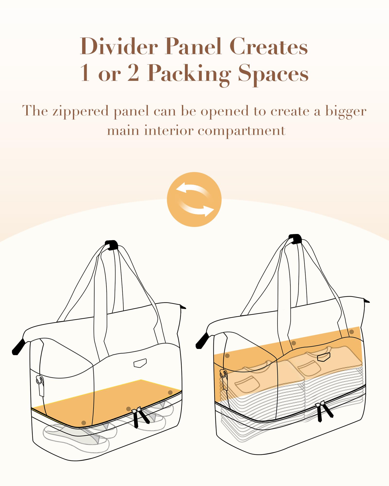 - Divider Panel Creates 1 or 2 Packing Spaces: The zippered divider panel provides separation between the main compartment and the foldable bottom section. Keep it closed to create separate packing areas, or pull it up to create one large packing space