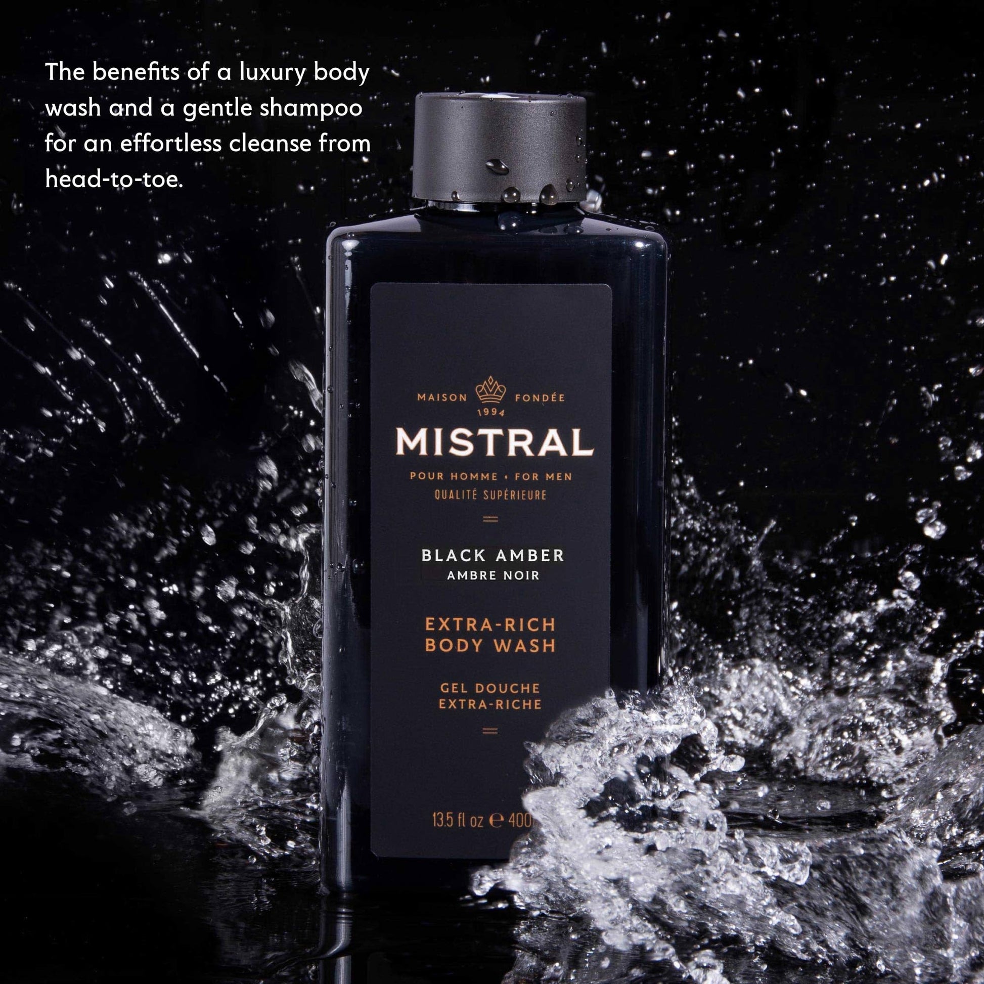 Mistral Men's Body Wash & Shampoo, Black Amber 13.5 oz | 2-in-1 Natural Shower Gel for Men | SLS, Paraben & Phthalate Free | Natural Men’s Body Wash, Moisturizing Bath Gel - Made in France