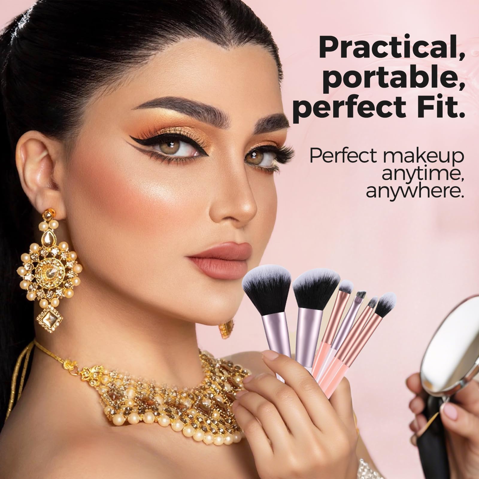 MOGILAN Travel Makeup Brush Set – Portable 6PCS Mini Cosmetic Brushes for Foundation, Concealer, Eyeshadow, Blush, Powder, Contour & Highlight, On-the-Go Makeup Brush Kit with Travel Case