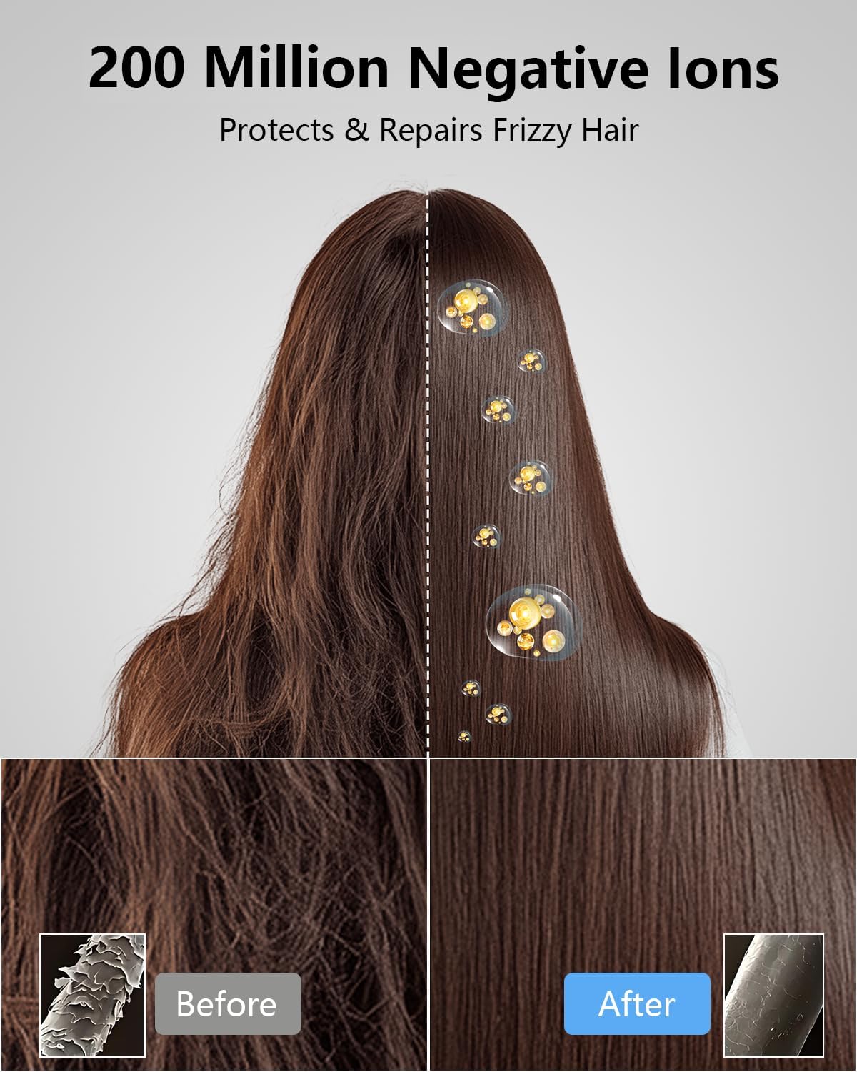 - 【200Millions Ions = Salon-Smooth Results】Ditch frizz and boost shine! This blow dryer for women blasts 200 million negative ions to lock in moisture, tame flyaways, and leave hair sleek—no salon trip needed. Achieve mirror-ready hair daily, whether home styling or freshening up on-the-go