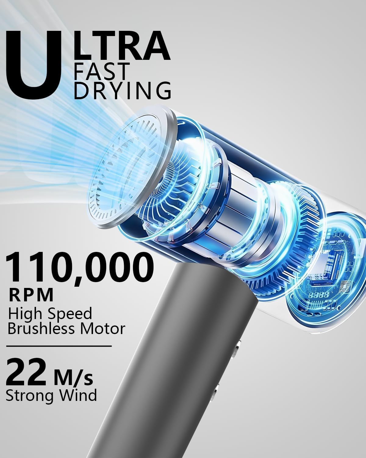 - 【Travel-Ready, Tangle-Free Design】Weighing less than a textbook, this lightweight hair dryer boasts a 360° magnetic nozzle for salon-worthy styling on the go. Its US ALCI safety plug ensures safety, while the removable micro-filter resists clogs. Compact and tangle-free, this travel hair dryer slips seamlessly into luggage—your perfect companion for adventure-ready glam