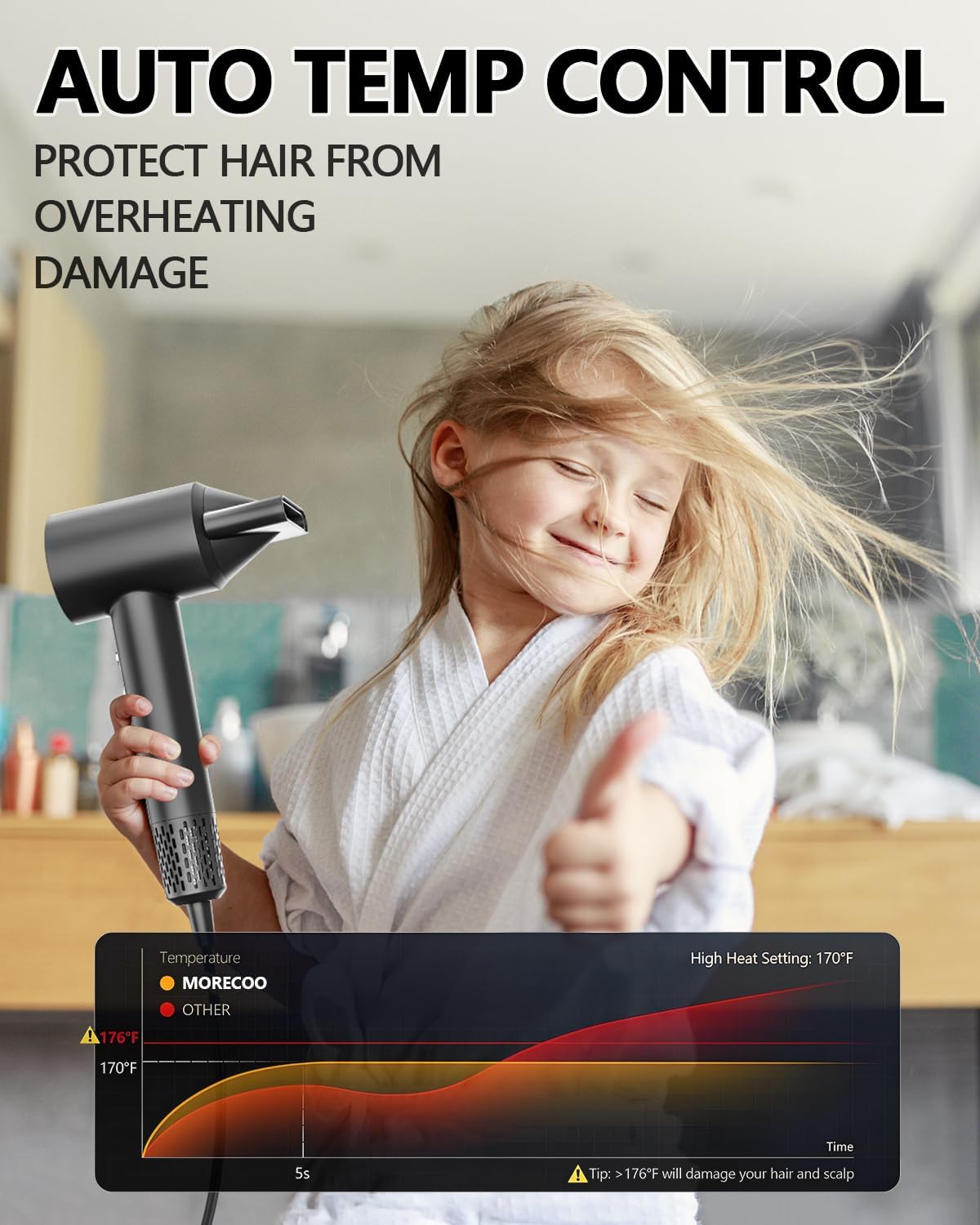 MORECOO Hair Dryer, High-Speed Travel Blow Dryer for Fast Drying, Professional 200 Millions Ionic Hair Dryers for Women with 4 Temp & 2 Speed Mode, Low Noise Compact Hair Dryer for Men with ALCI Plug
