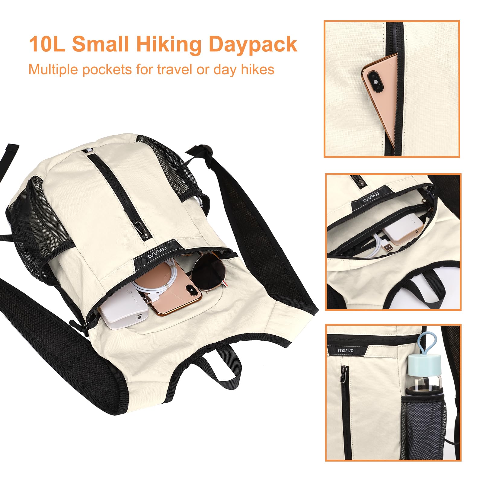 - Daypack Hiking Backpack. The main compartment of this small hiking backpack has enough space for clothing, hats and other outdoor/travelling stuff. The front vertical pocket is convenient for storing your mobile phone, wallet, sunglasses or other frequently used items for easy access. 2 mesh bags in each side for water bottle or umbrella (up to largest diameter 2.5 inch).