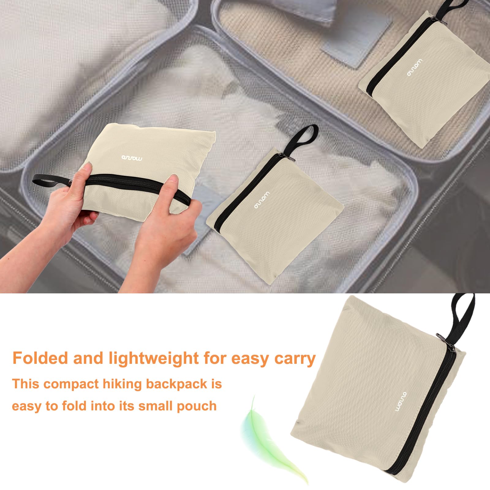 - 10L Lightweight Hiking Backpack. Dimensions of this lightweight daypack: 14.57 x 7.48 x 3.93 inches (L x W x H). Folded size: 7.87 x 5.9 inches (L x W). This compact hiking backpack is easy to fold into its small pouch (its own inner pocket for packing). This small hiking backpack is only 0.59 lbs, the lightweight folded size can be easily stored in pockets, suitcases, handbags and other bags for easy carrying and use.