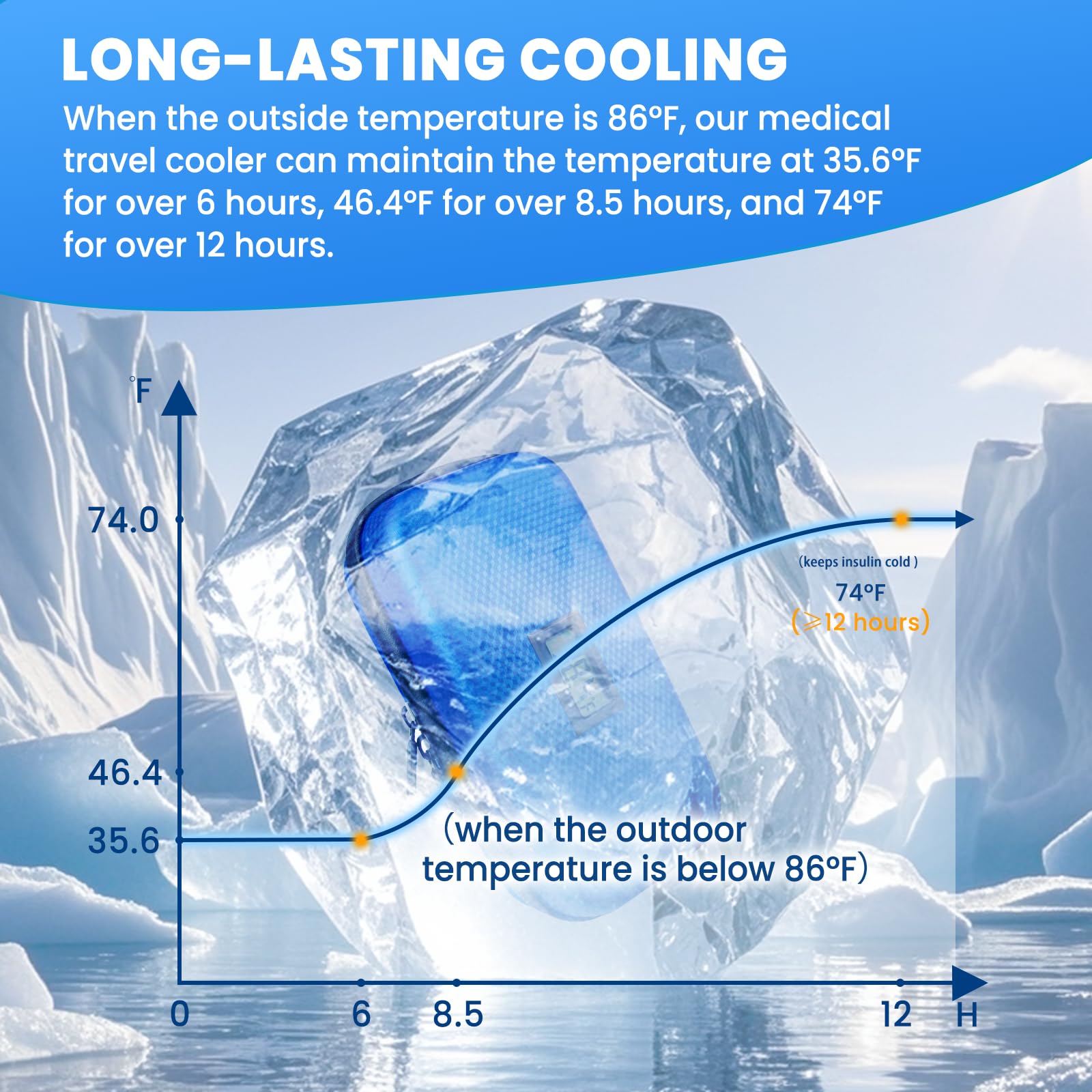 - LONG-LASTING COOLING - With two ice packs (TSA Approved), after freezing for 5-8 hours, the ice pack will keep the temperature at 35.6-46.4°F for 12+ hours when the outdoor temperature is below 86°F. Our pharmaceutical travel cooler keeps insulin cold (below 74°F) for over 24 hours.