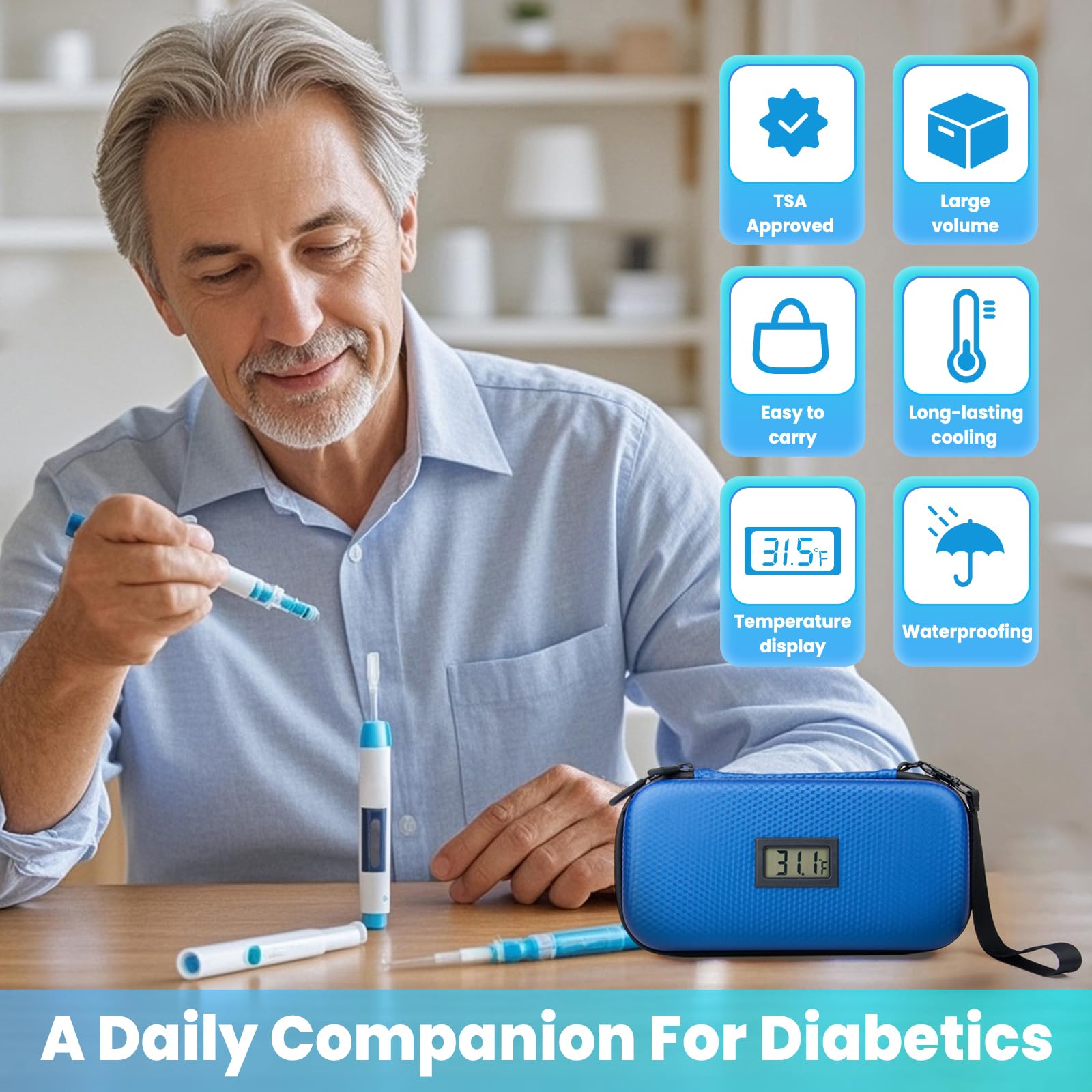 - TRAVEL INSULATED COOLER CASE - This portable diabetic supplies cooler is made of EVA on the outside and aircraft insulated pearl cotton and aluminum foil lined insulation on the inside. No electricity is required. It protects your insulin pen for up to 12 hours without power.
