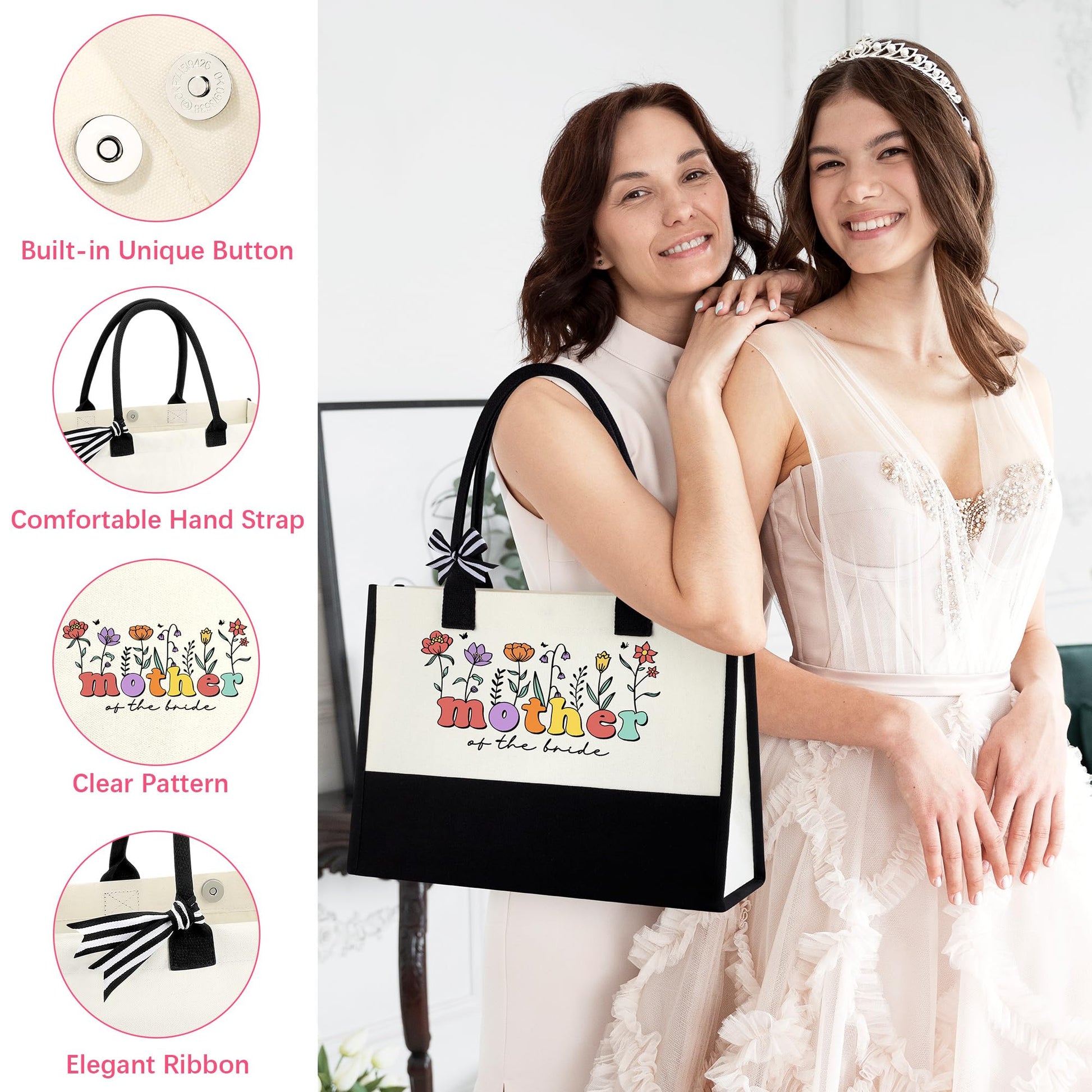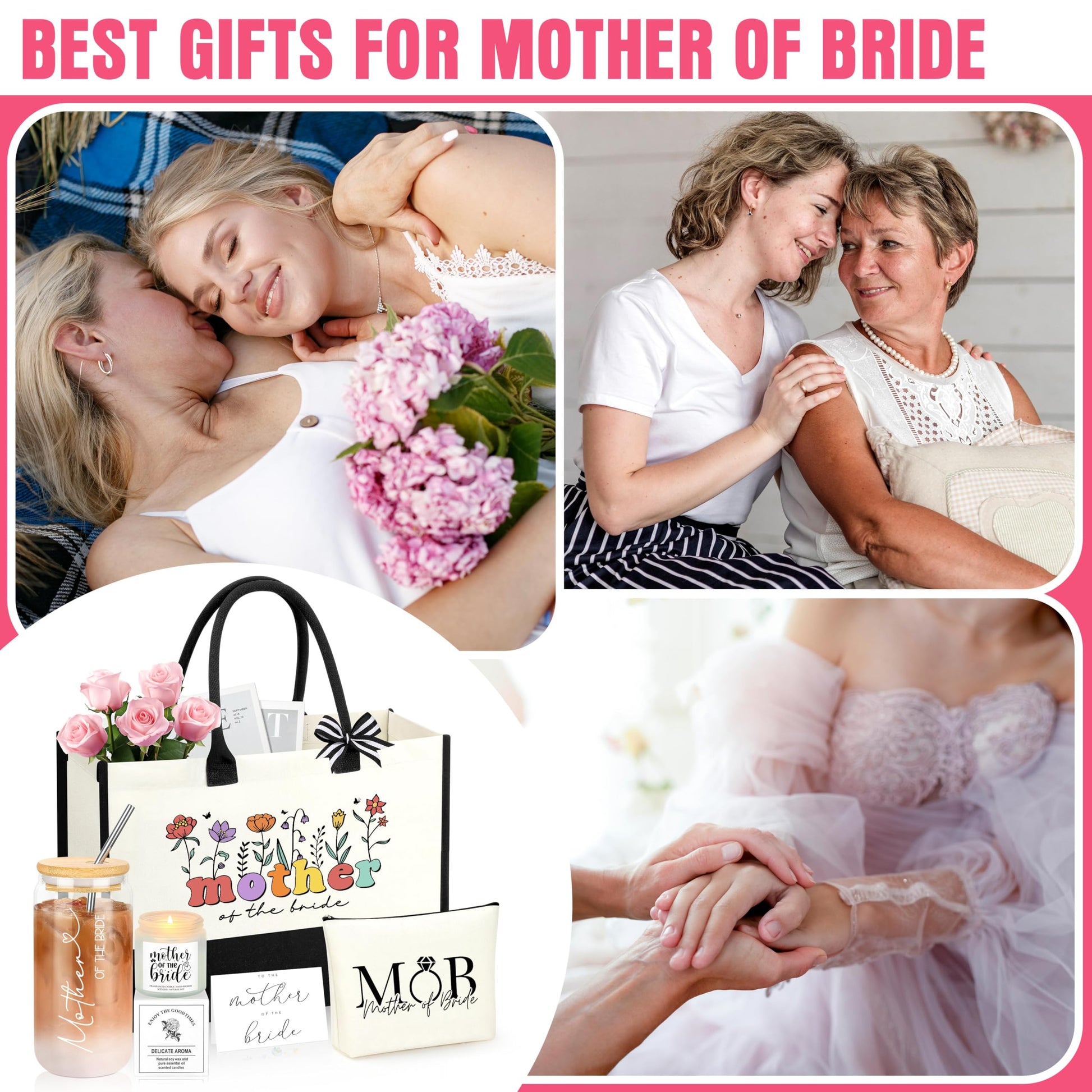 - 【Mother of the Bride Gifts】This elegant gift set includes:1*16 oz glass cup with lid and straw, 1* high-quality coated tote bag, 1*stylish cosmetic pouch, 1*beautifully crafted greeting card.Perfect for the bride’s mother, this thoughtful gift is ideal for engagement parties, bridal showers, bachelorette celebrations, or wedding festivities. A heartfelt way for the daughter to show appreciation during this special time.