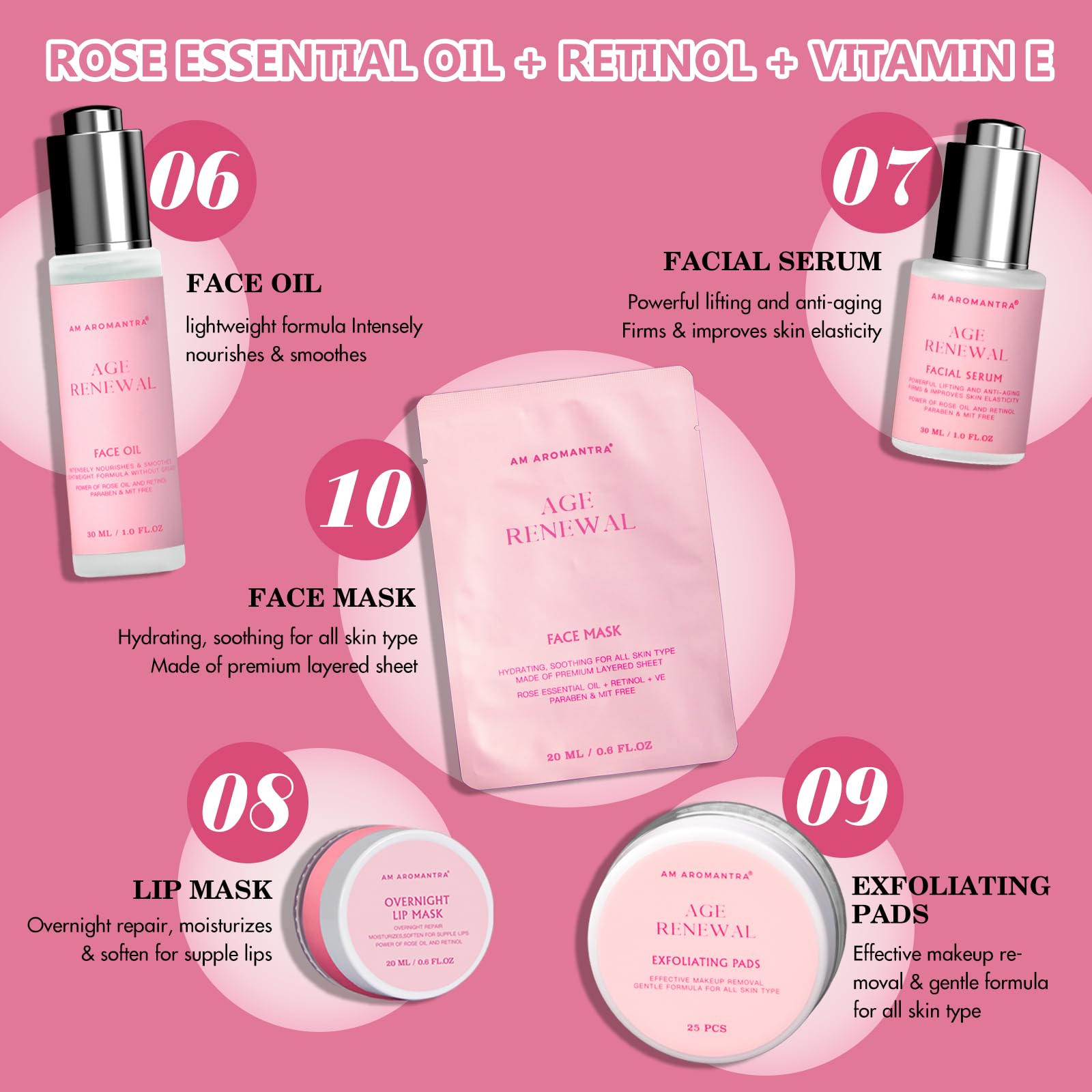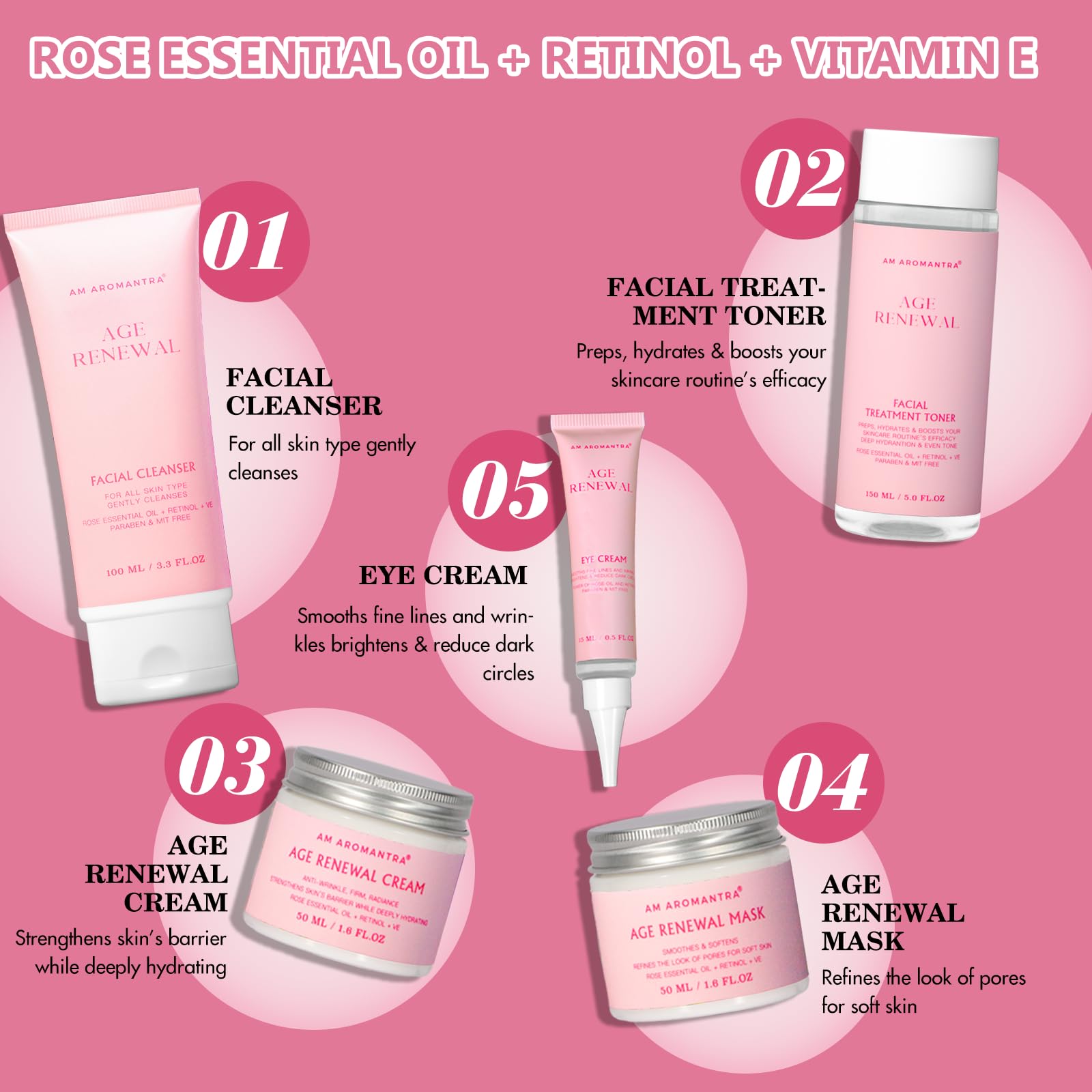 - 【Powerful Ingredients for Radiant Skin】 This skincare set combines the transformative power of Retinol, Vitamin E, and Rose Flower Oil. Retinol, renowned for its anti-aging properties, helps to reduce fine lines and promote cell turnover. Vitamin E, a potent antioxidant, protects the skin from environmental stressors and keeps it hydrated. Rose Flower Oil adds a touch of luxury, soothing the skin and enhancing its natural glow