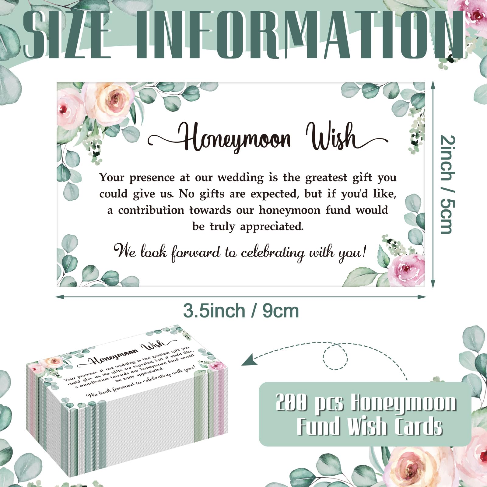 - 200 Honeyfund Cards: get 200 elegant honeyfund cards to share your honeymoon wishes! Perfect for telling guests 'no gifts' while inviting contributions; Ideal for any wedding size—plenty for all guests