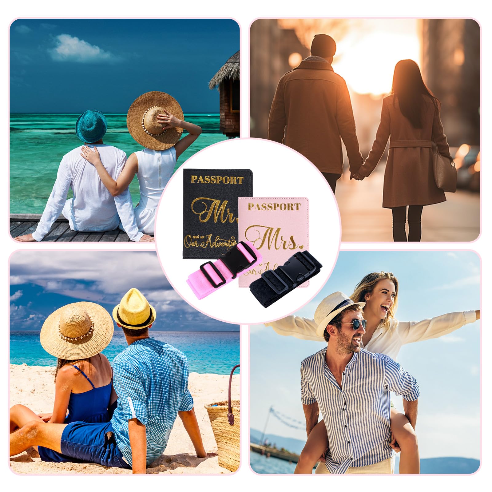 Mr and Mrs Luggage Straps for Suitcases with Matching Passport Holders, Honeymoon Wedding Travel Gift Set for Couples, Bridal Shower Gifts, Newlyweds, Bride, Valentine's Day (Black & Pink)