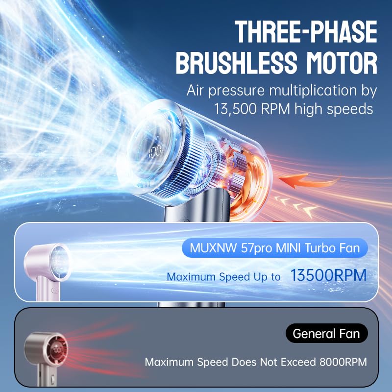 - Mini turbo jet fan: It features a 100 Level high-speed, powerful 7m/s airflow, powered by a 3-phase brushless electric motor running at 13,500 RPM, delivering fast and strong performance. With adjustable speed (1-100 levels) and a bladeless design, it ensures safety for kids and teens.