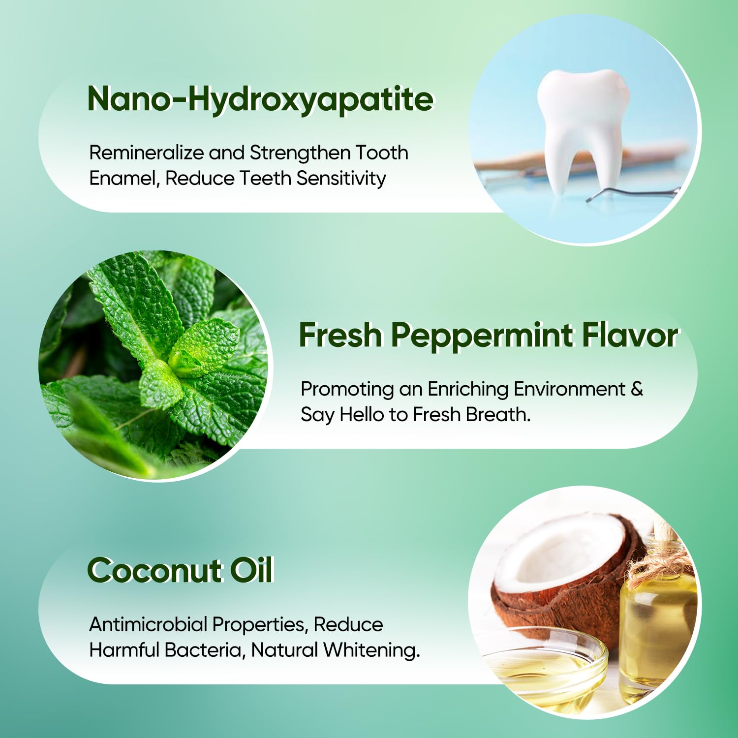 - NANO HYDROXYAPATITE: Helps to remineralize and strengthen tooth enamel, making it beneficial for people with sensitive teeth. Nano hydroxyapatite can effectively fill in microscopic enamel imperfections and provide protection against tooth decay.