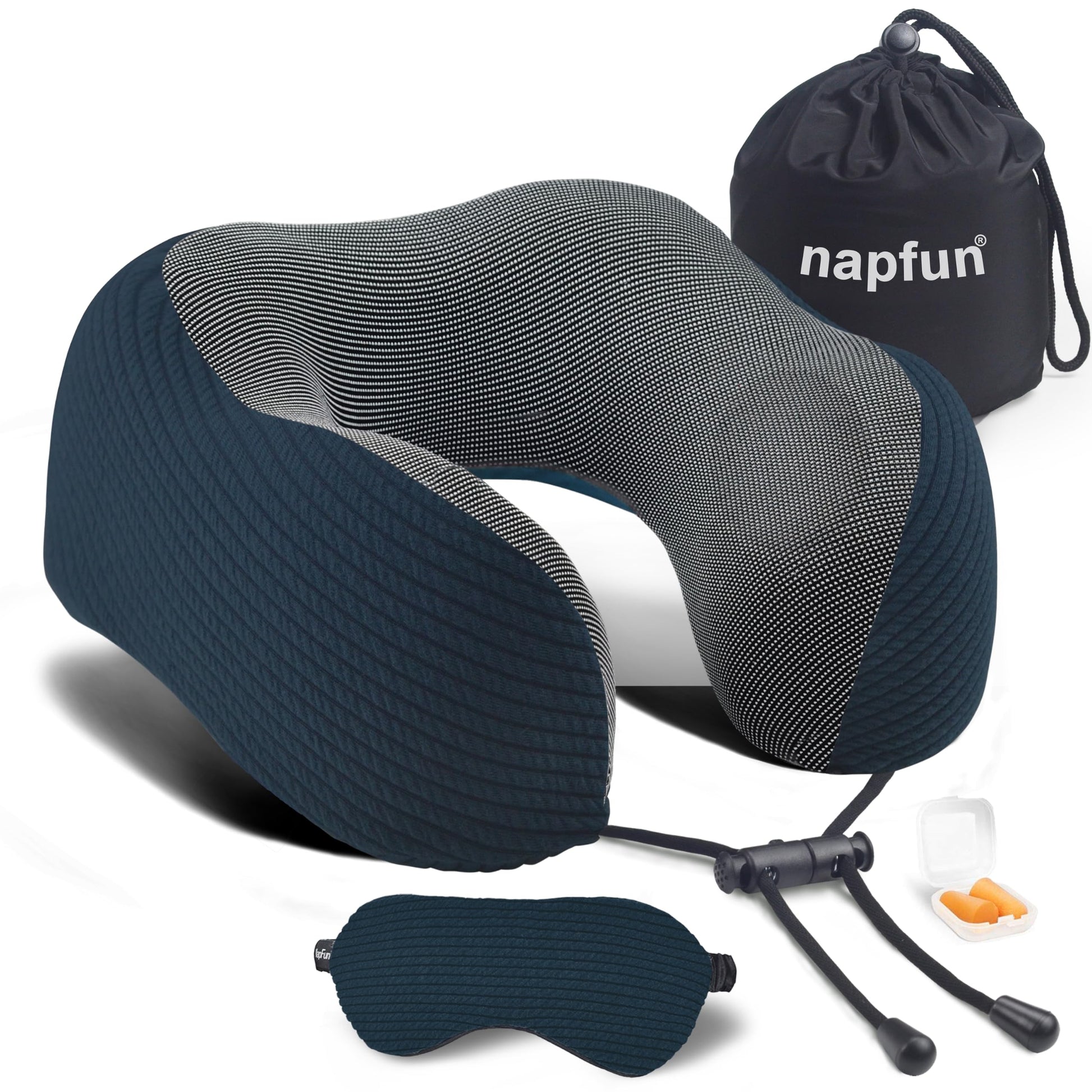 napfun Neck Pillow for Traveling, Upgraded Travel Neck Pillow for Airplane 100% Pure Memory Foam Travel Pillow for Flight Headrest Sleep, Portable Plane Accessories, Deep Blue Set, Medium (120-200LB)