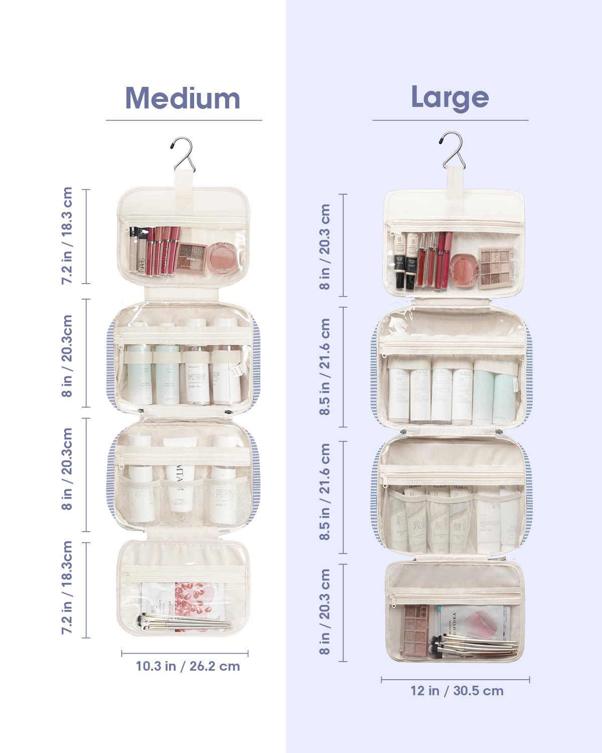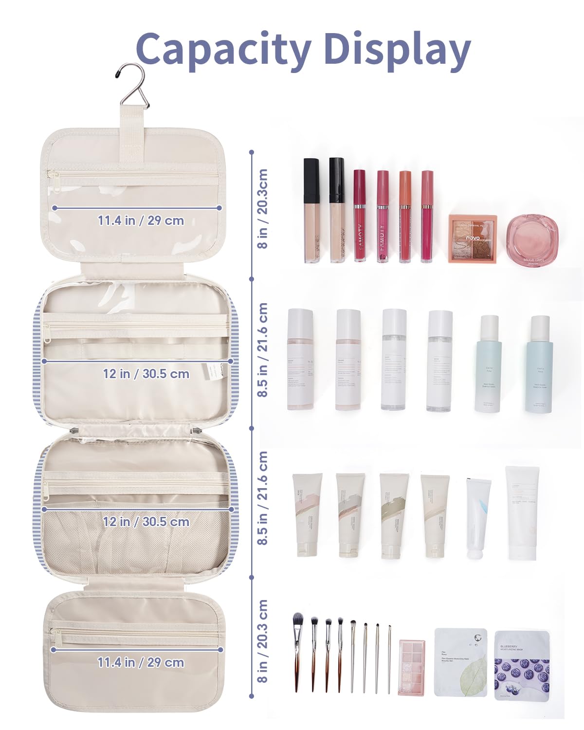 Narwey Striped Travel Toiletry Bag for Women Large Hanging Makeup Bag Organizer Toiletries Bag for Full Size Essentials Accessories Cosmetics (Greyish Blue Stripe (Large))