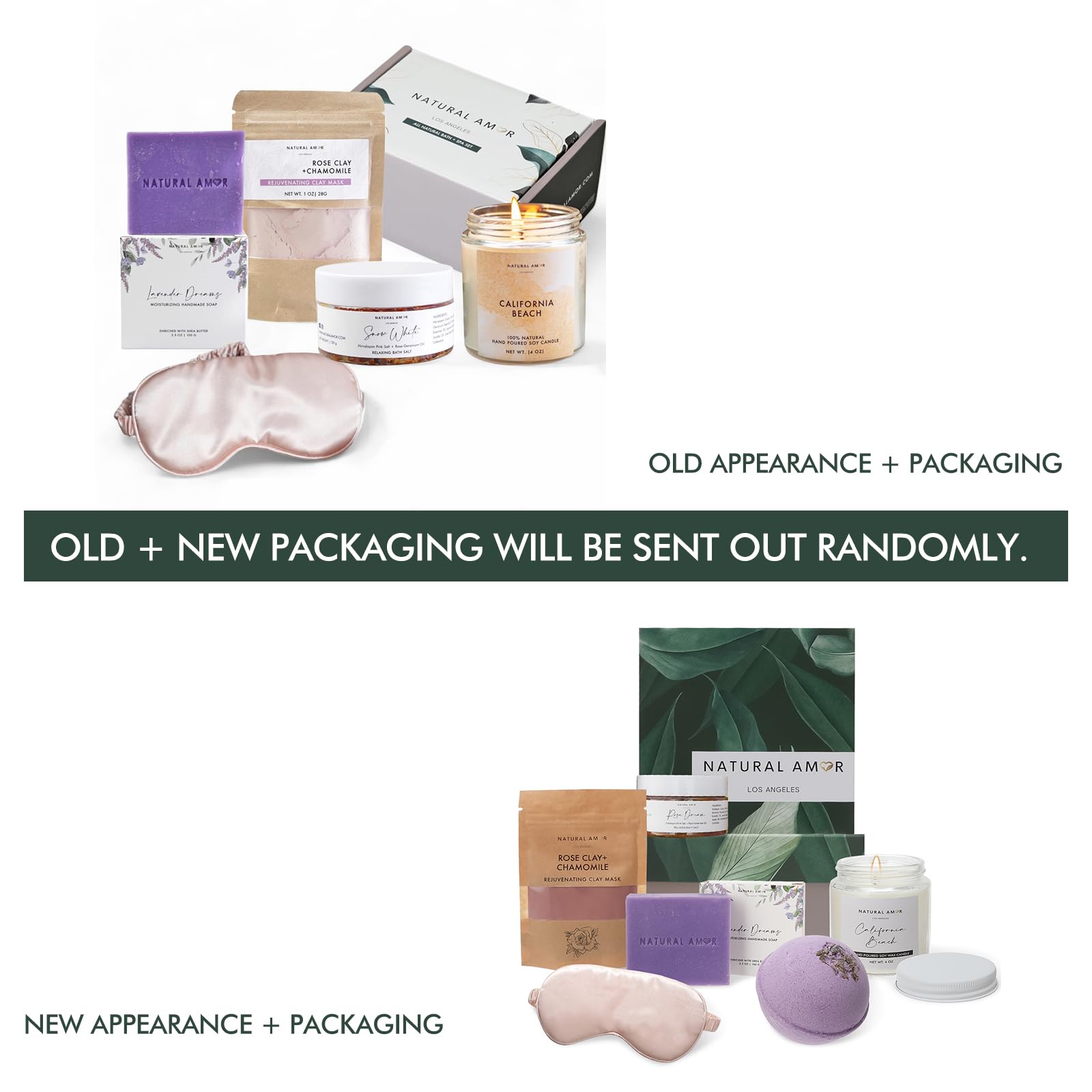 Natural Amor Spa Gift Set for Women – Handmade Lavender Soap, Rose Clay Mask, Candle, Rose Bath Salt & Sleep Mask – Relaxing Self Care Kit, Birthday Gift Box for Her