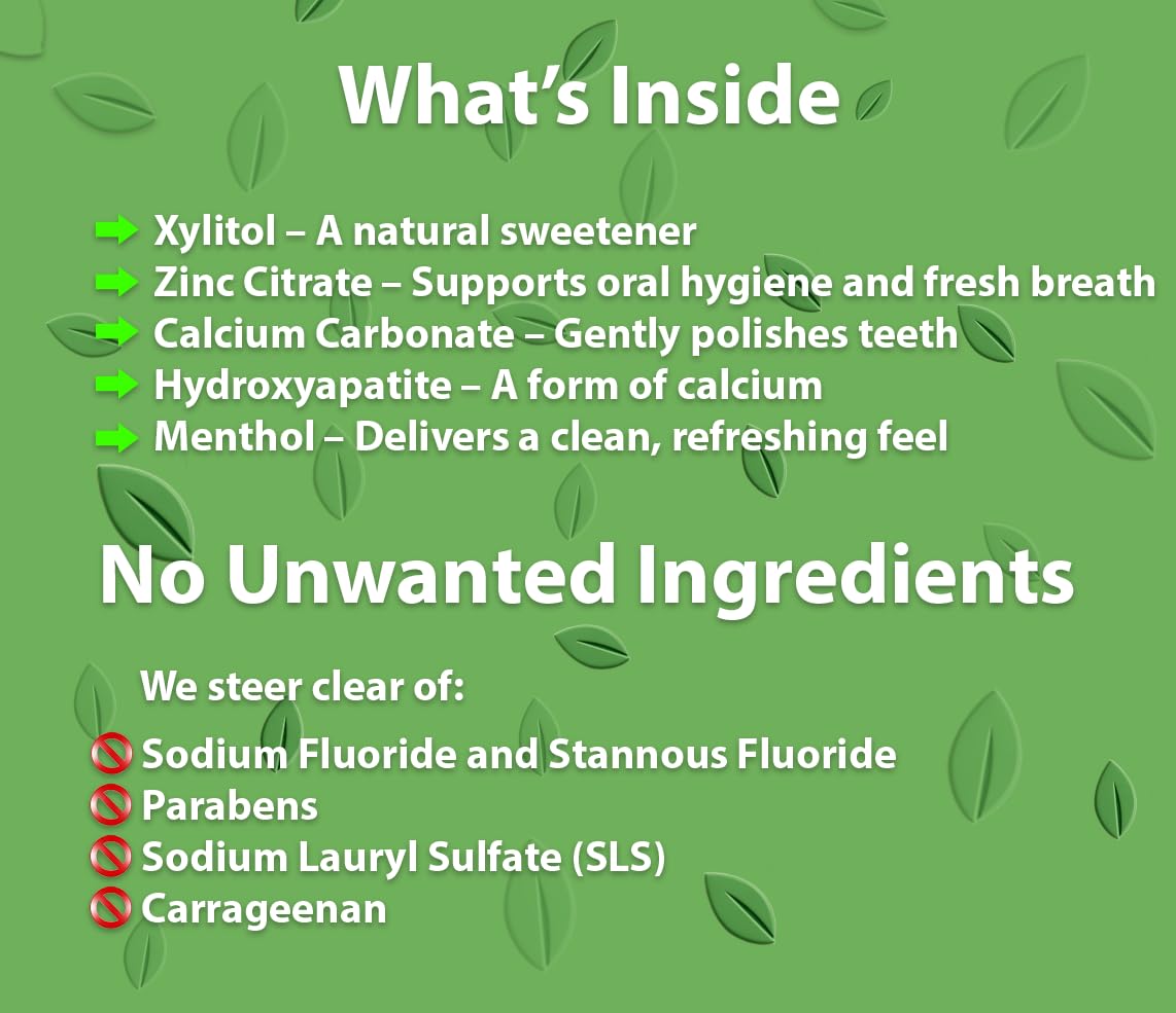 - NATURAL INGREDIENTS: Contains xylitol (natural sweetener), calcium carbonate for gentle polishing, and hydroxyapatite for dental care, with refreshing spearmint flavor
