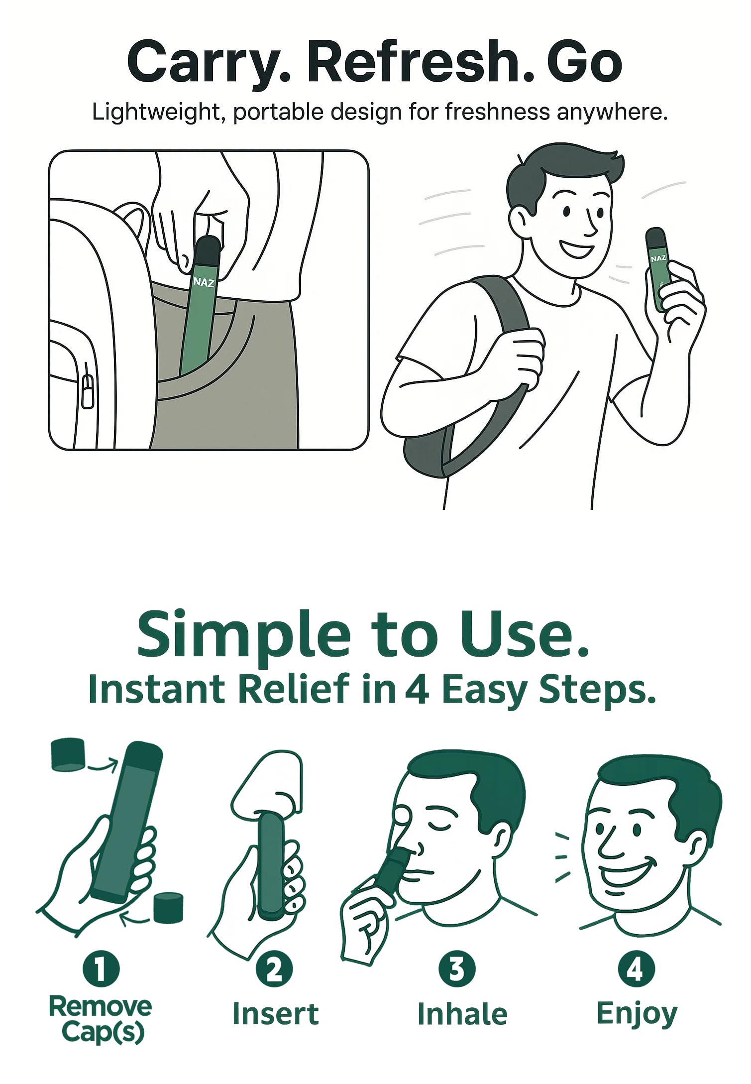 - 💨 [Portable & Easy To Use] NAZ nose inhaler stick is small and light, fitting effortlessly into your pocket or bag—perfect for on-the-go use anytime you need a refresh. Simply insert into your nostril and inhale to experience the cool, refreshing menthol scent and mist through your nostrils, bringing a soothing sensation