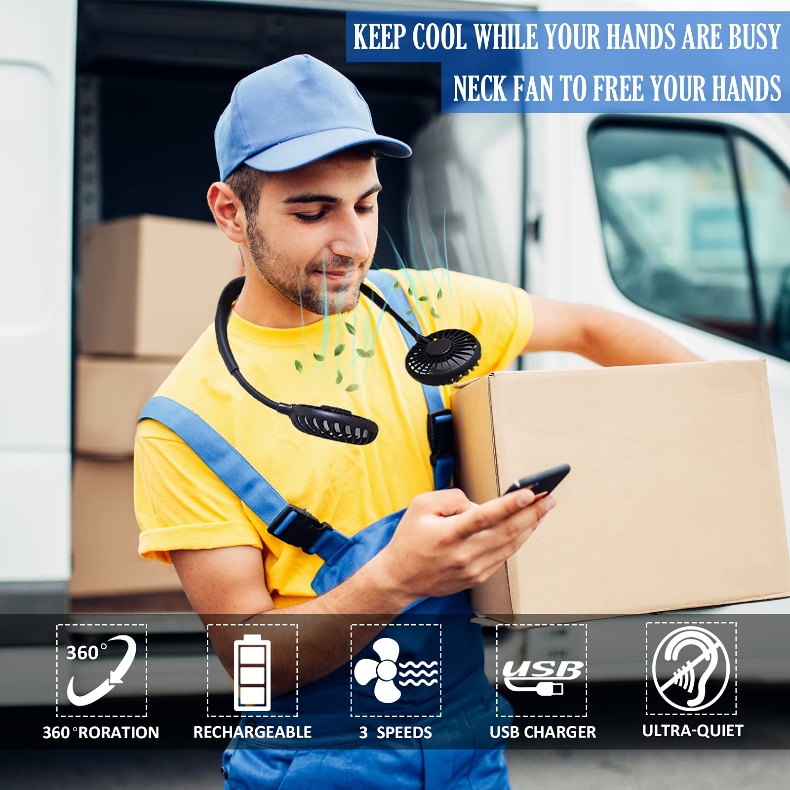 - 【Lightweight and Portable Small Fan, Easy to Use】This small fan only weighs 6.5oz/185g, lightweight and comfortable to hanging around the neck fan all day long. 100% hands-free neck fan, with a little imagination anyone could adopt this clever design for seemingly endless uses. Ideal Gifts for Mother's Day, Father's Day, Back to school kids.