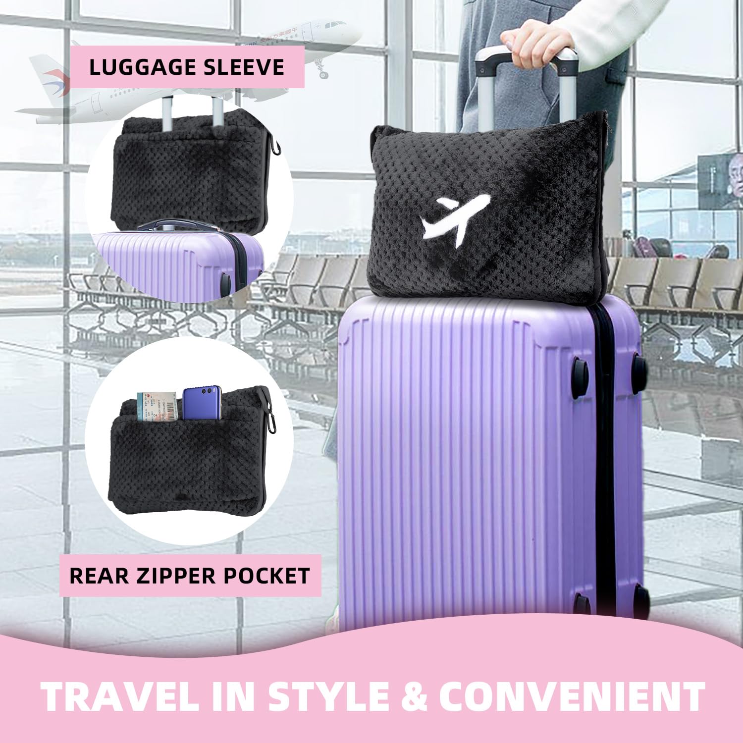 - 3) CARRY BAG - Our travel blanket set comes with a portable carry bag. The back of the carry bag has a zippered pocket to store your phone, passport and more, keeping your essentials secure on the go. The carry bag itself features a dual-zipper design that doubles as a hand warmer when it's chilly out