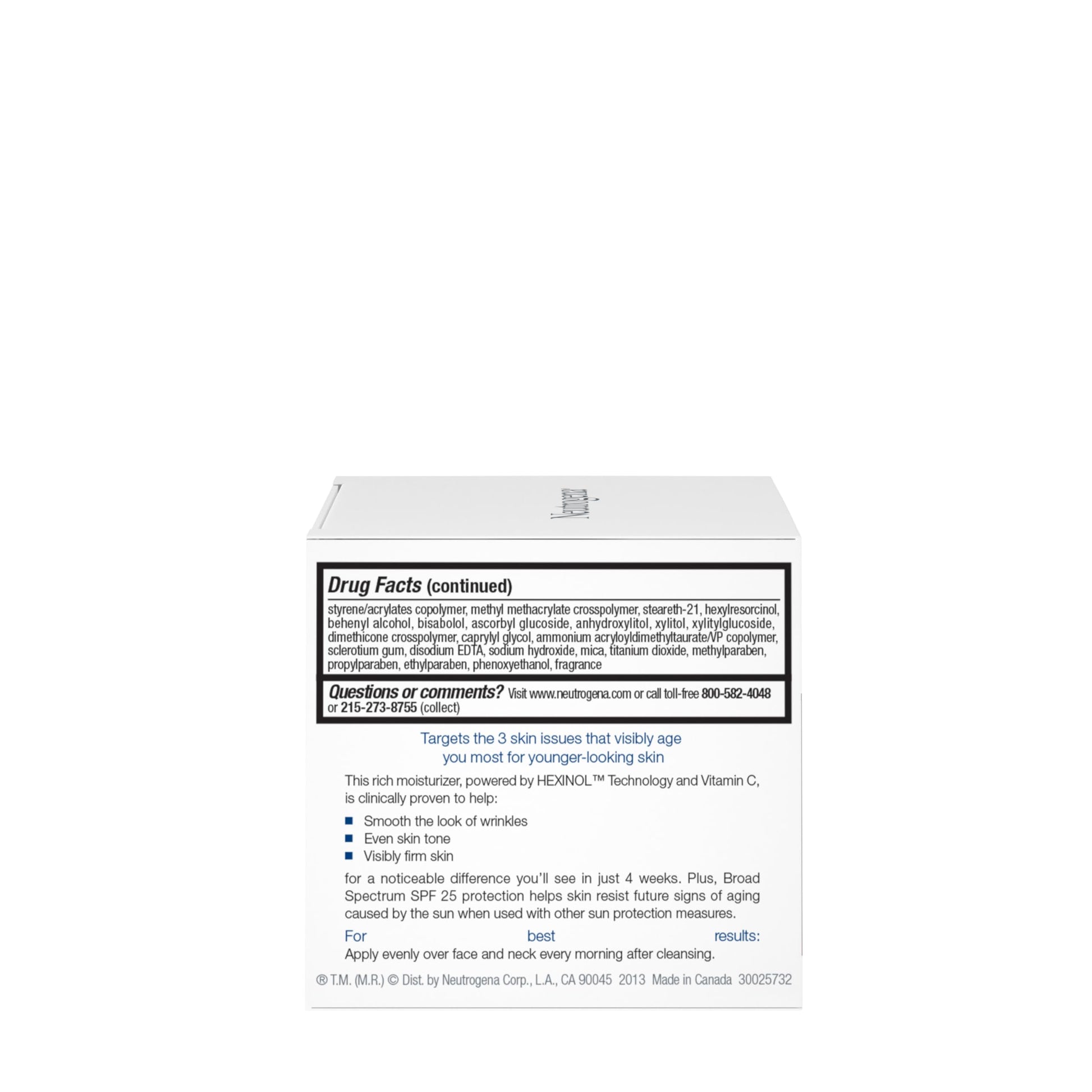 Details: Discover Neutrogena Triple Age Repair, an effective anti-wrinkle face cream targeting wrinkles, uneven tone, and loss of firmness. This Neutrogena face moisturizer delivers visible improvements in just four weeks, helping you achieve smoother, more radiant looking skin. Formulated as a powerful wrinkle cream for women and men, it features innovative Hexinol technology that helps visibly smooth the appearance of wrinkles and boost firmness. As skin matures, its ability to repair diminishes—Hexinol helps improve skin's ability to enhance it’s appearance and visibly smooth wrinkles. Enriched with brightening vitamin C, this moisturizing cream helps fade the look of dark spots and evens skin tone for a luminous complexion. Nourishing shea butter and hydrating glycerin replenish moisture, leaving your face and neck soft, smooth, and comfortably hydrated. This facial moisturizer with SPF 25 offers broad-spectrum protection against harmful UVA/UVB rays that cause premature skin aging. When used with other sun protection measures, helps decrease the risk of early skin aging caused by the sun. Neutrogena Triple Age Repair moisturizing cream is crafted to enhance your natural beauty through effective, everyday care. For best results, apply this face cream evenly to clean face and neck each morning. Neutrogena is not anti-aging—it's anti-wrinkles. The brand's philosophy supports healthy, hydrated, and even-looking skin.