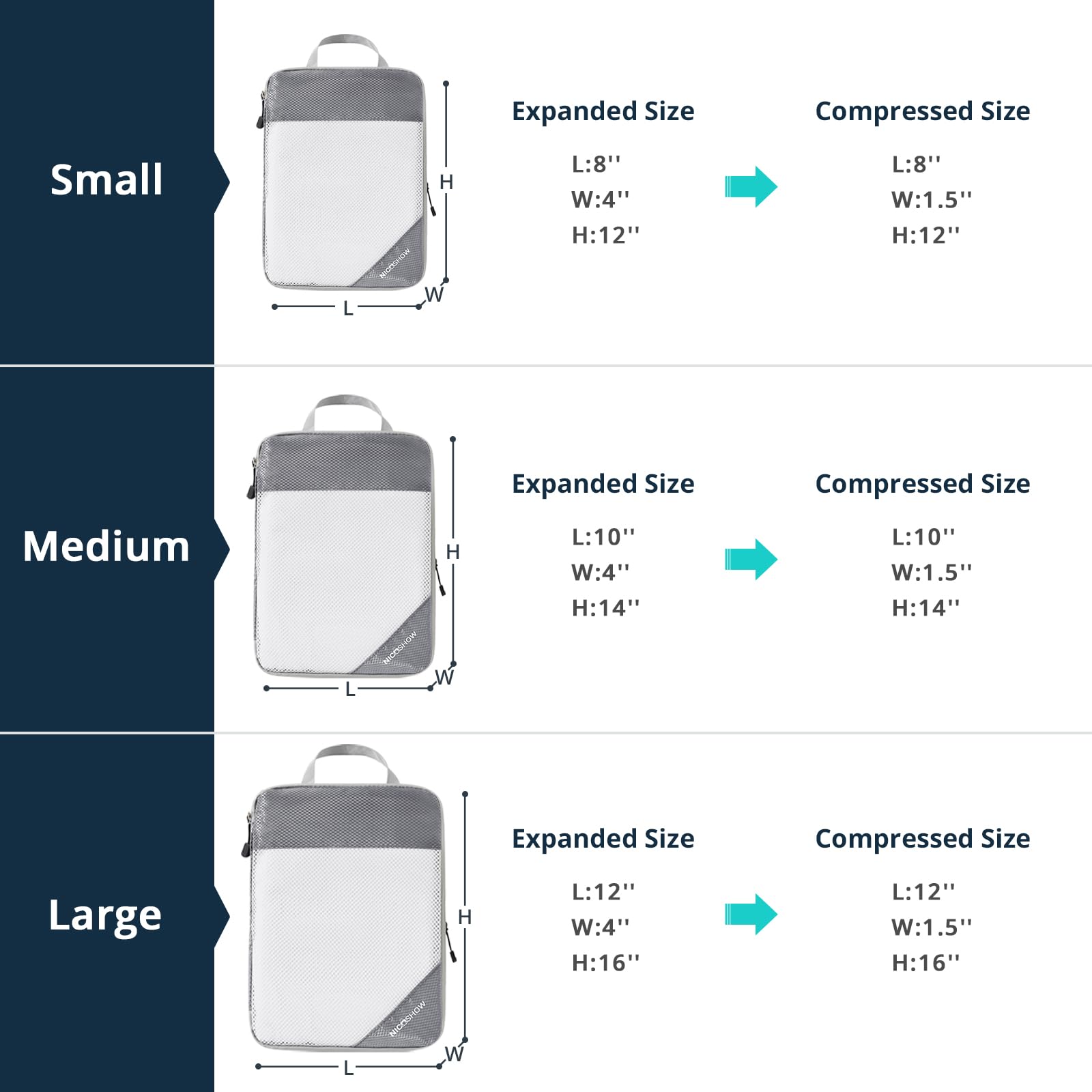 - What Will You Get: NICOSHOW 6-set compression packing cubes for travel include 2 small cubes (12''x8''x4''), 2 medium cubes (14''x10''x4''), 2 large cubes (16''x12''x4'')