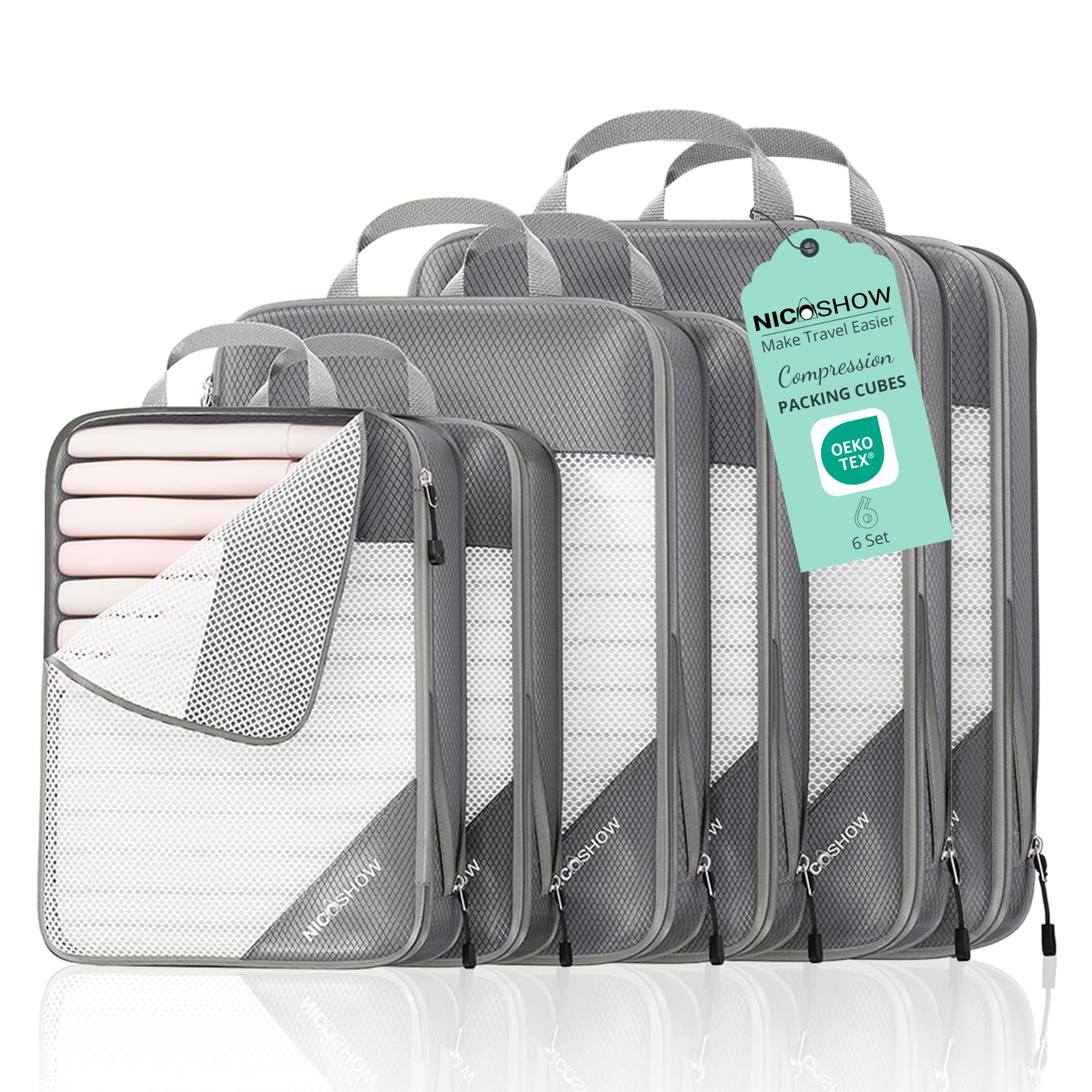 NICOSHOW 6 Set Compression Packing Cubes for Travel - Compressible, Lightweight, and Space-Saving Packing Cubes, Travel Essentials for Women, Grey