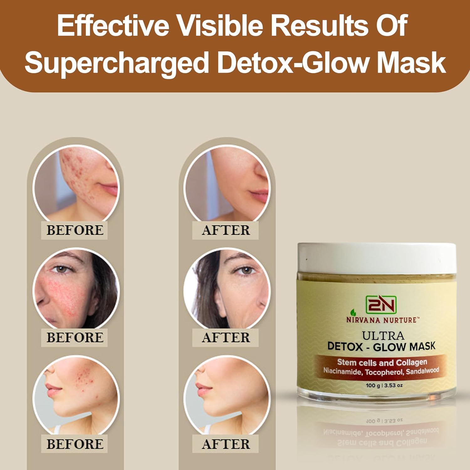 - ENHANCE SKIN GLOW: Nirvana Nurture Detox-Glow mask enriched with active nutrients from Gotu Kola Stem Cells, Collagen, and Sandalwood. This potent blend revitalizes dull skin, replenishing moisture for a glow skin. Collagen works to restore skin firmness and texture, while Sandalwood diminishes blemish skin, improves skin radiant and controls oil production naturally.