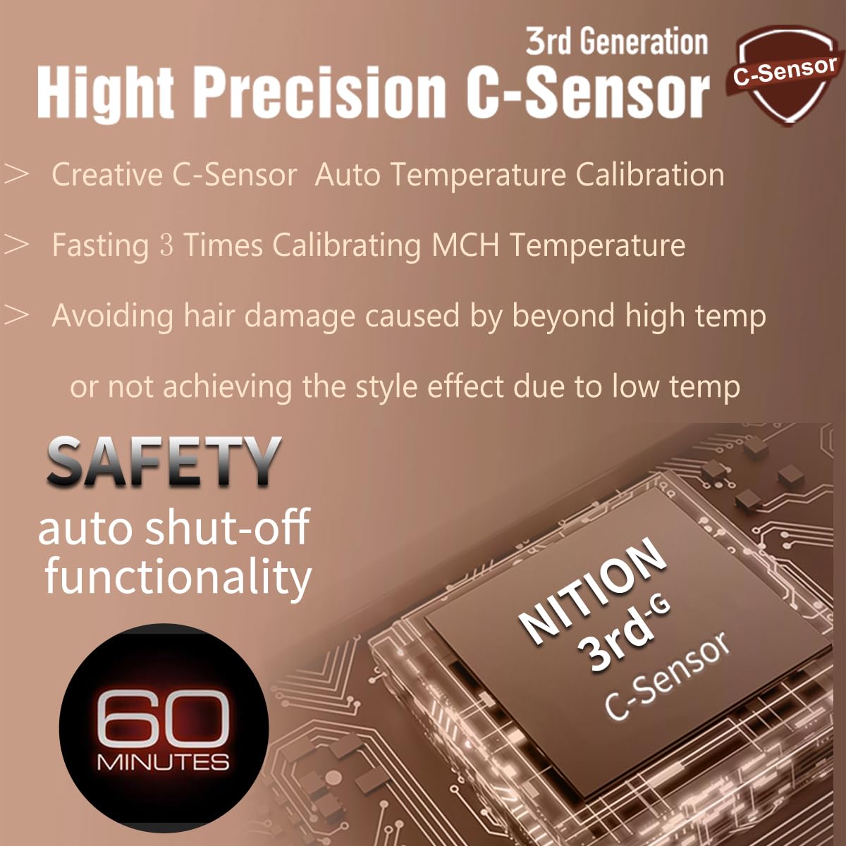 - With MCH Fast Heating Up & unique C-Sensor Feature(Auto Temperature Calibrating), it gives evenly, fast recovery heat and helps to achieve the best style effect with long lasting. NITION flat iron has 4.1" long heating plate which provide more heating contacted area than normal short one, means styling a bunch of more hair at a time, more efficient.