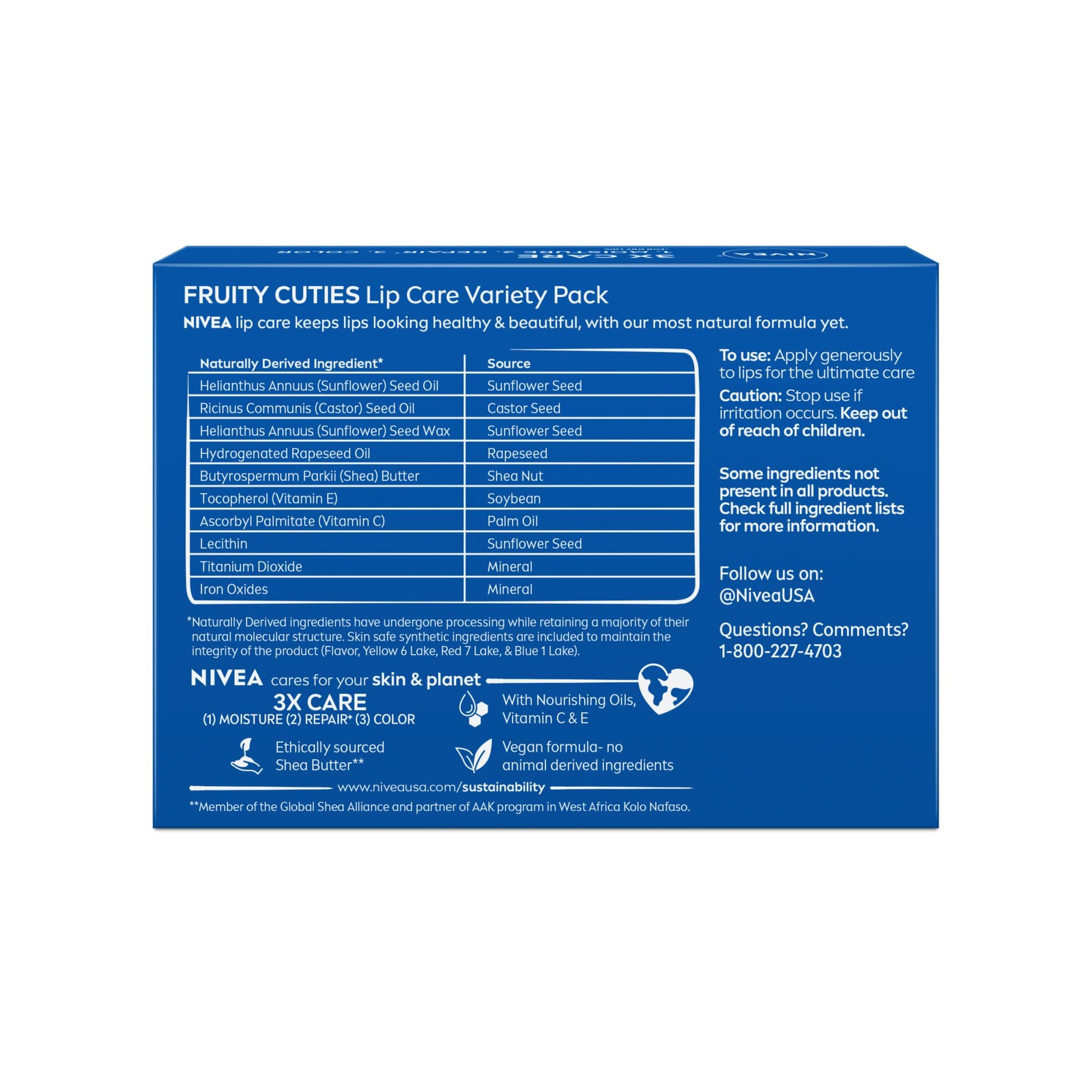 Details: This NIVEA Lip Care Fruit Lip Balm Variety Pack includes four delicious fresh fruit flavors that provide lips with long-lasting moisture and a touch of color. This hydrating lip balm pack includes cherry, strawberry, blackberry and watermelon. These tinted lip balms are enriched with ethically sourced Shea Butter(1), Nourishing Oils, Vitamin C and Vitamin E, and help moisturize and repair dry lips. Each flavored lip balm leaves lips with a beautiful tint and subtle shine. NIVEA Lip Care colored lip balms care for your lips and the planet with a vegan formula made with no animal-derived ingredients and 98% naturally derived ingredients.(2) Keep a lip balm stick in your desk, pocket, purse or car for healthy-looking, soft lips at a moment's notice. From the World's No. 1 Lip Care Company.(3) (1) Member of the Global Shea Alliance and Partner of AAK program in West Africa Kolo Nafaso. (2) Naturally Derived Ingredients have undergone processing while retaining a majority of their natural molecular structure. 2% skin safe synthetic ingredients are included to maintain the integrity of the product (Flavor, Yellow 6 Lake, Red 7 Lake, Blue 1 Lake). (3) Euromonitor International Limited, Beauty and Personal Care 2024 edition, Beiersdorf AG, retail value RSP, 2023 data.