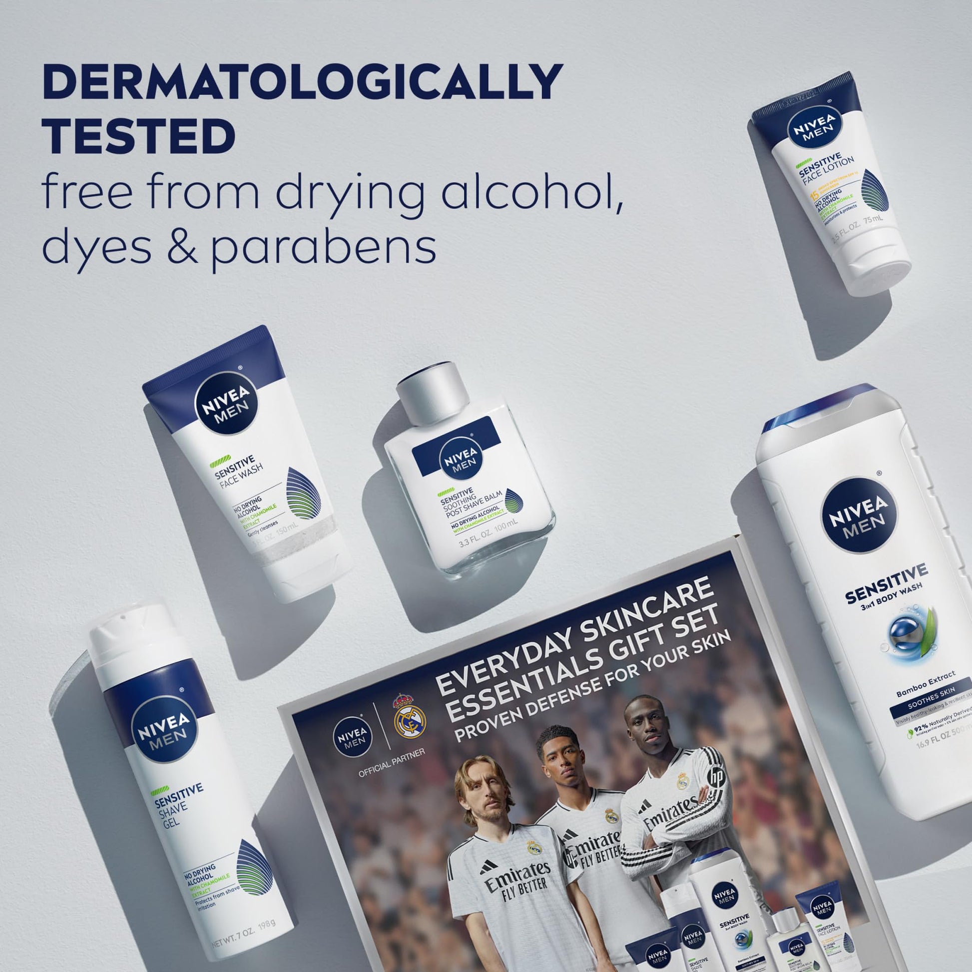 NIVEA MEN Sensitive Skin Care Set for Men, Face Wash, 5 Fl Oz + Body Wash, 16.9 Fl Oz + Shave Gel, 7 Oz + Soothing Post Shave Balm, 3.3 Fl Oz + Face Lotion SPF 15, 2.5 Fl Oz