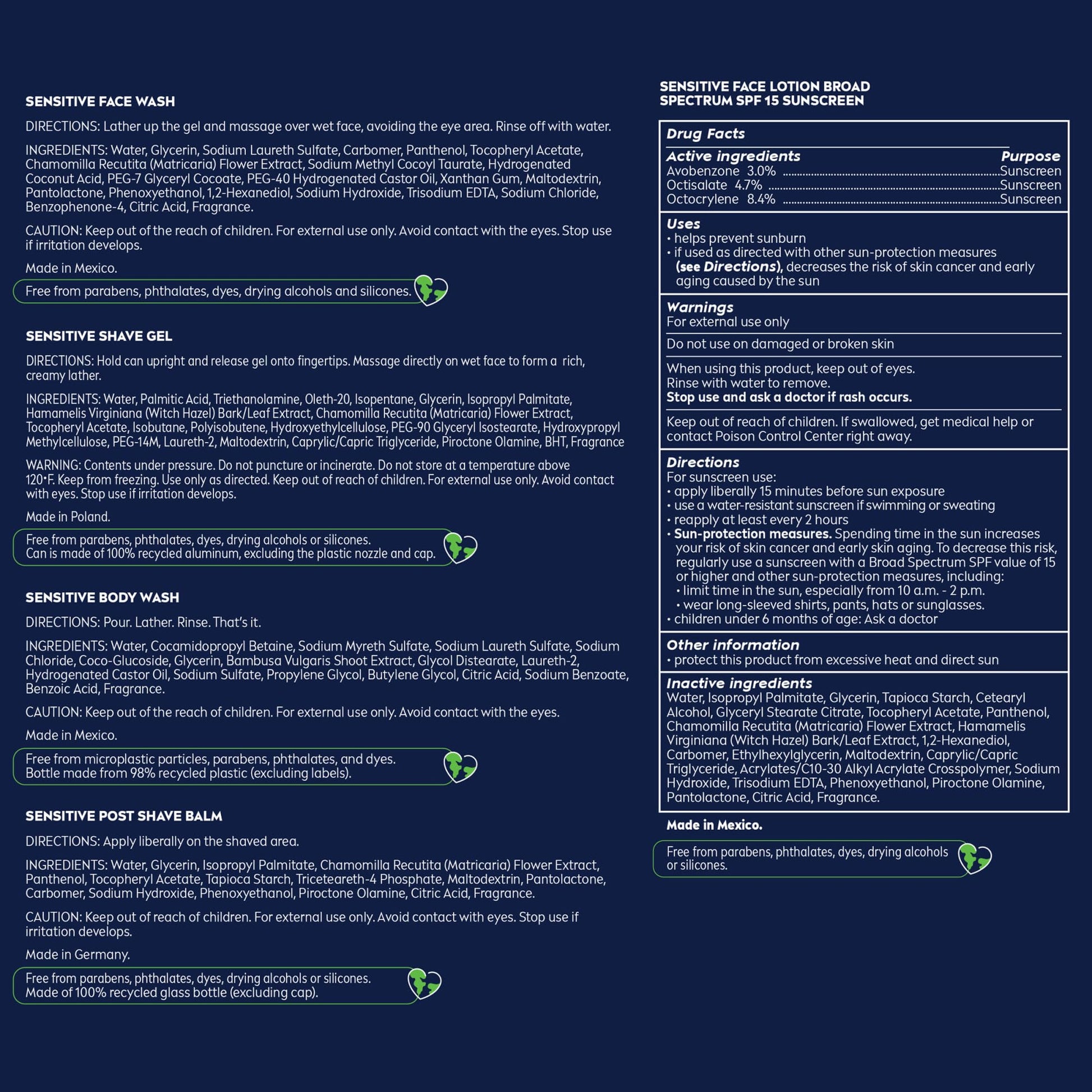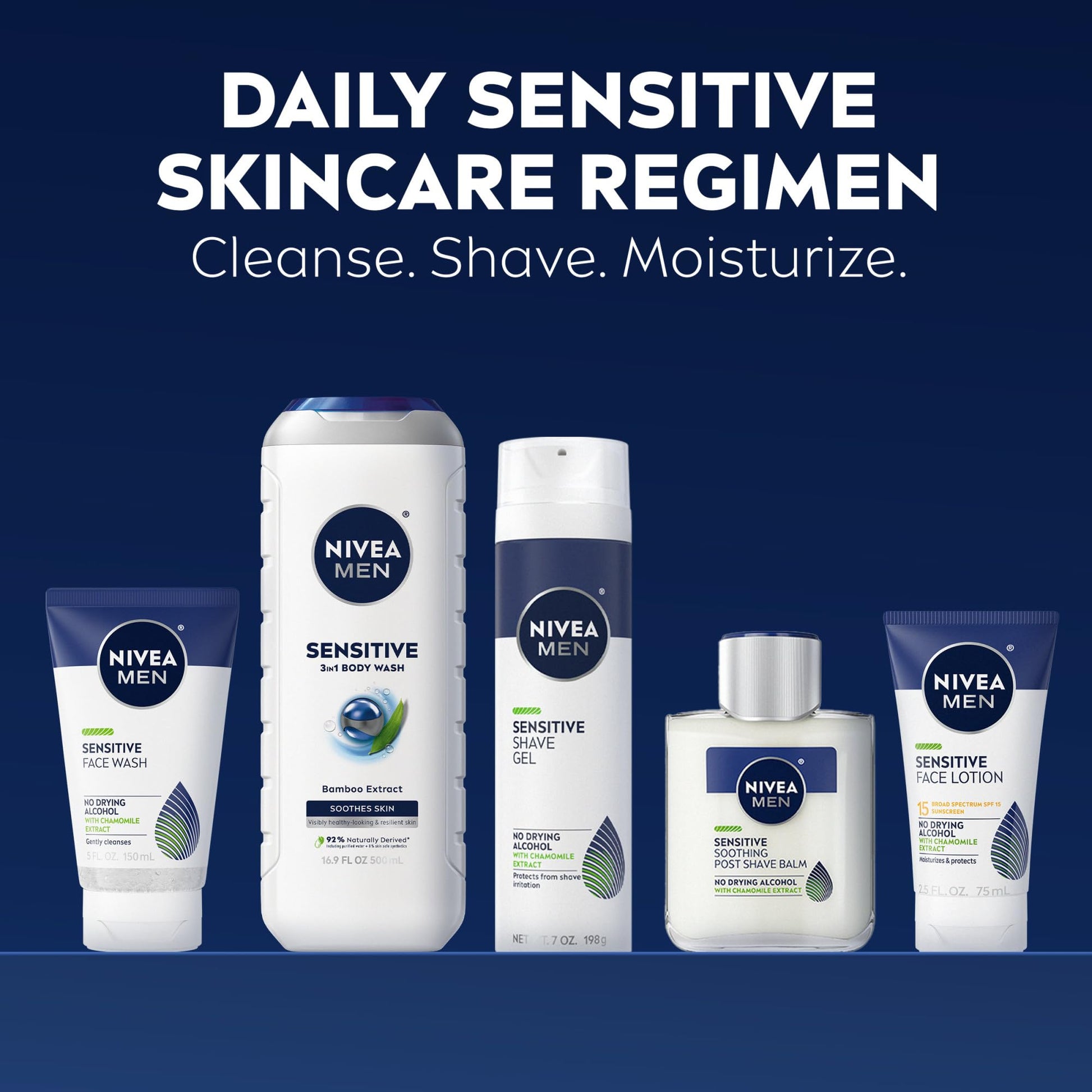 - INCLUDES: One (1) 5 fl oz tube of NIVEA MEN Sensitive Face Wash, one (1) 16.9 fl oz bottle of Sensitive Body Wash, one (1) 7 oz can of Shave Gel, one (1) 3.3 fl oz bottle of Soothing Post Shave Balm, and one (1) 2.5 fl oz tube of Face Lotion SPF 15