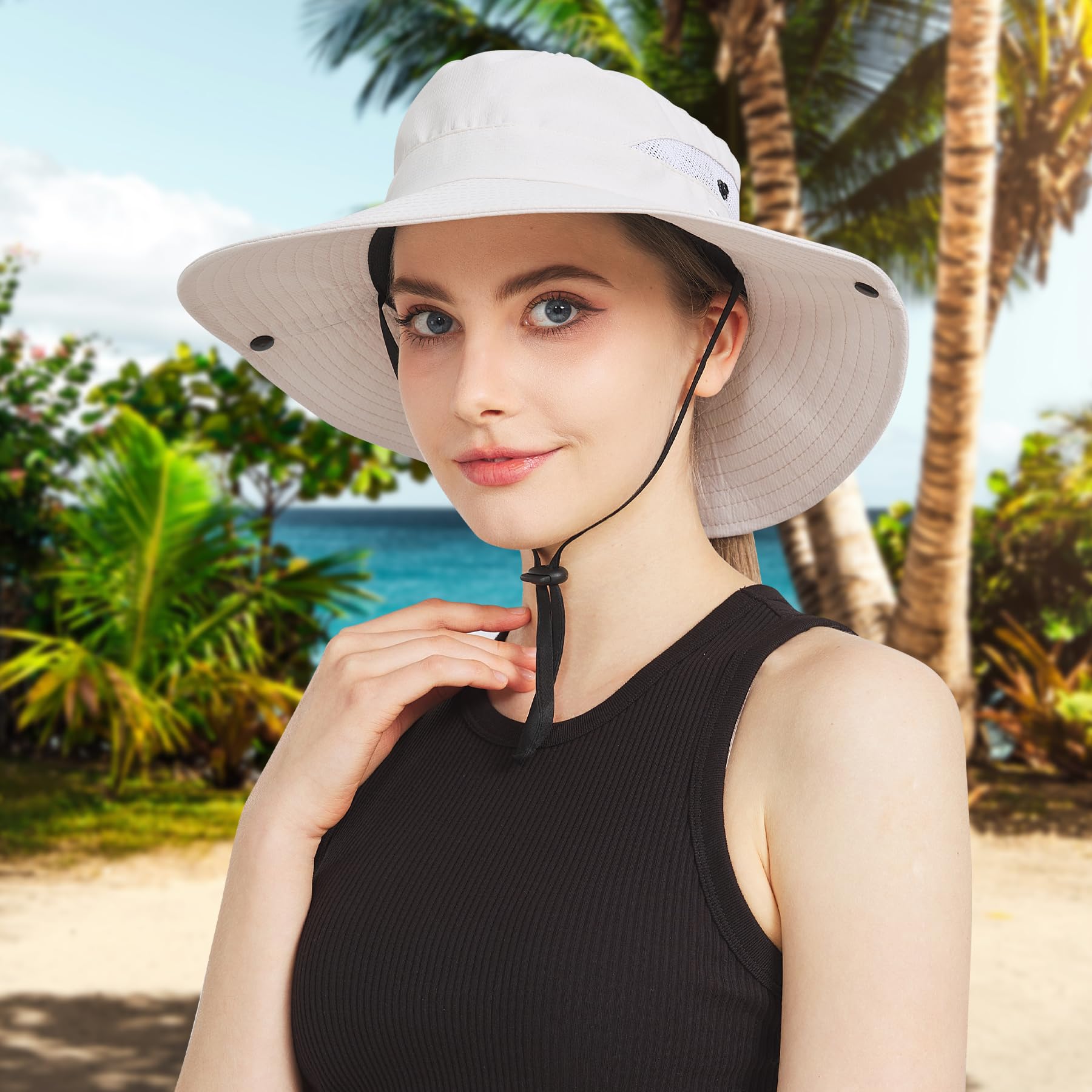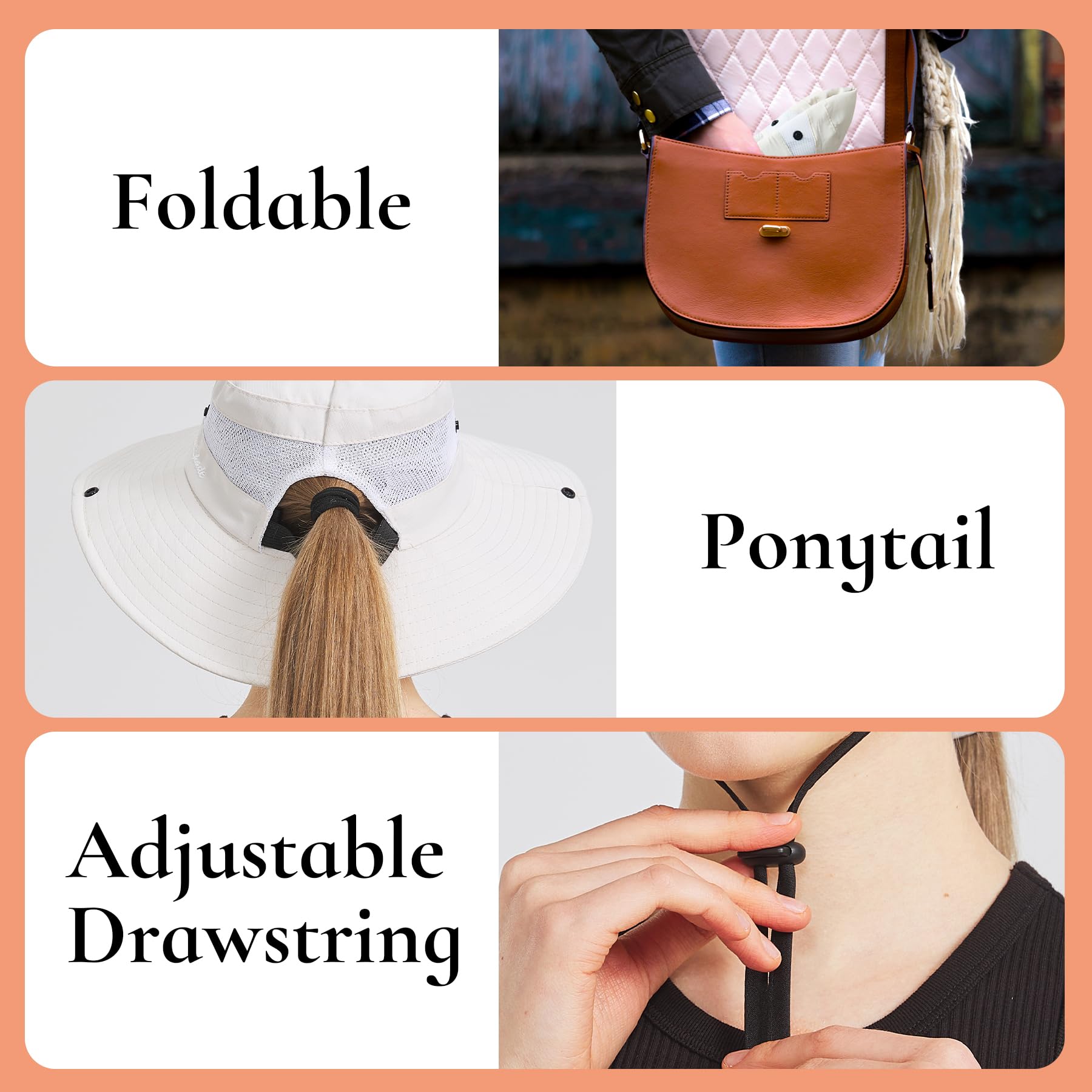 NPJY Ponytail Sun Hats for Women Men 3” Wide Brim UPF 50+ Fishing Beach Bucket Hats Beige