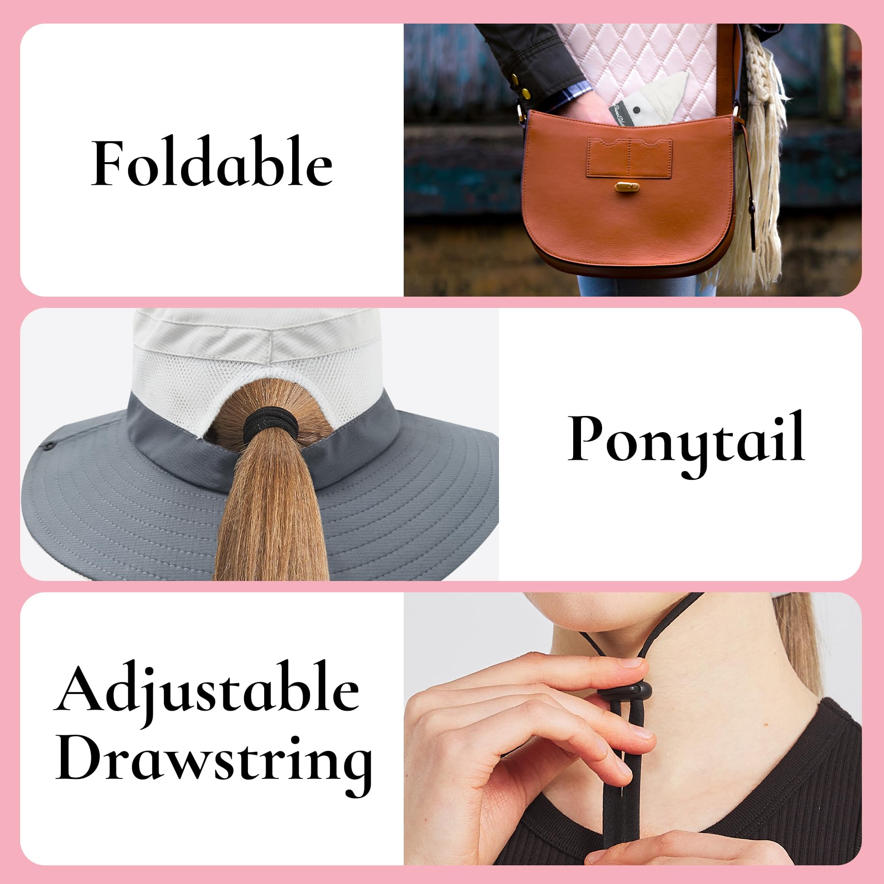 - Adjustable Drawstring: An adjustable chin strap ensures the women sun hat will not be lost on a windy day. Rear opening design fits women's low ponytail comfortably.