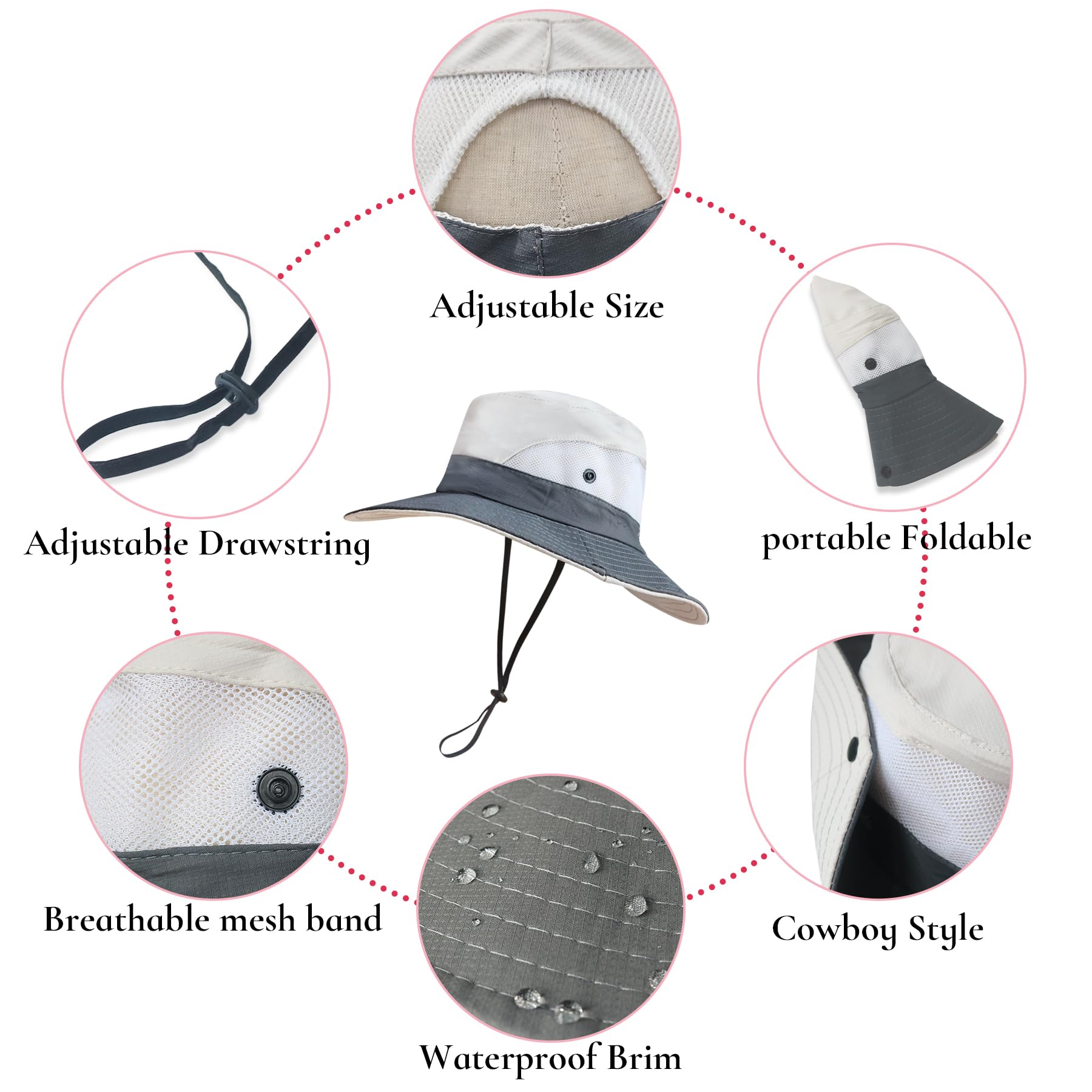 NPQQUAN Ponytail Sun Bucket Hat for Women Men Wide Brim UPF 50+ Fishing & Beach Hats Beige/Grey