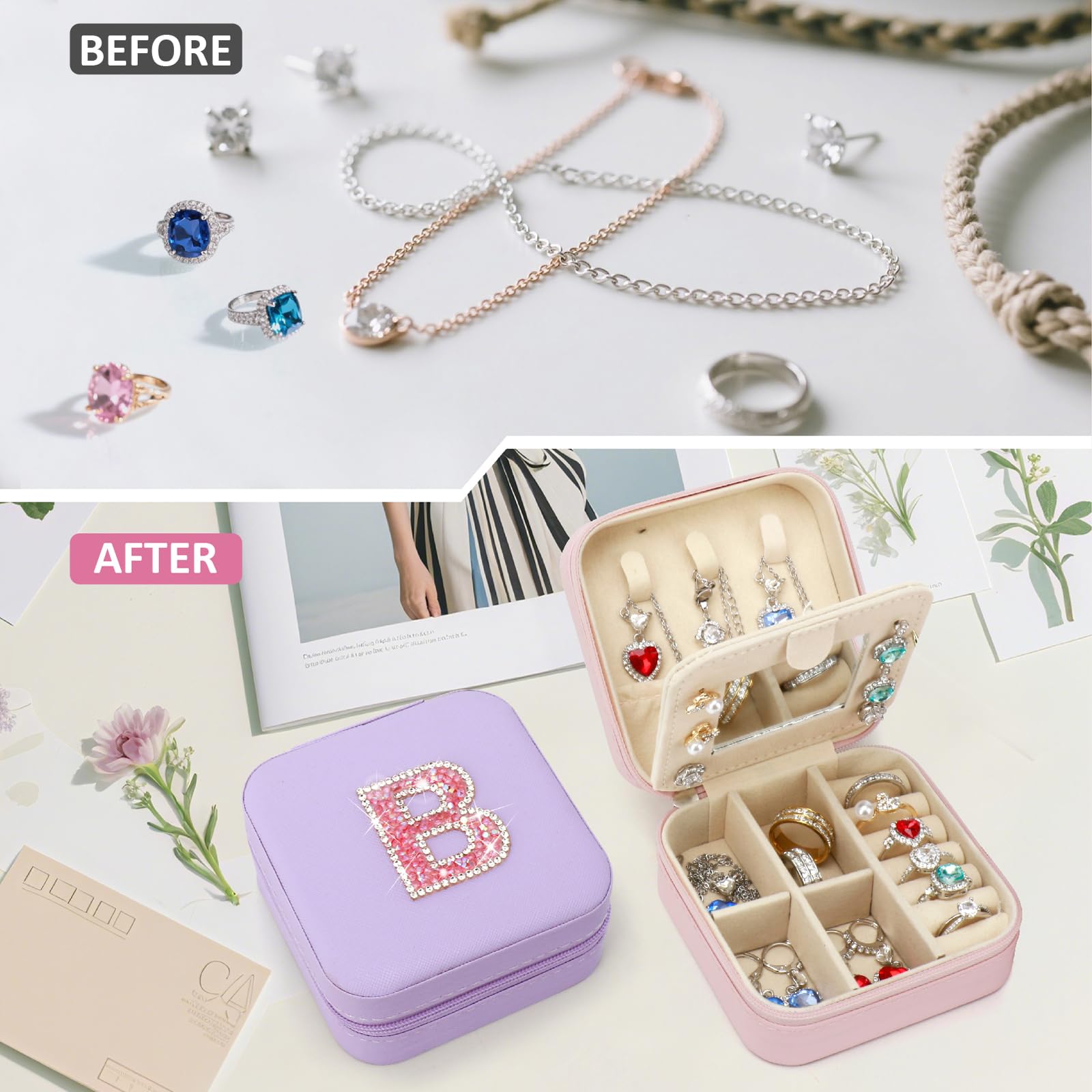 Nuozme Bling Sparkly Initial Jewelry Case,Personalized Gifts for Teen Girls,Kids,Women,Brides, Bridesmaids, Glitter Rhinestone Travel Jewelry Box,Easter Birthday Christmas Gifts, Small Size (Purple A)