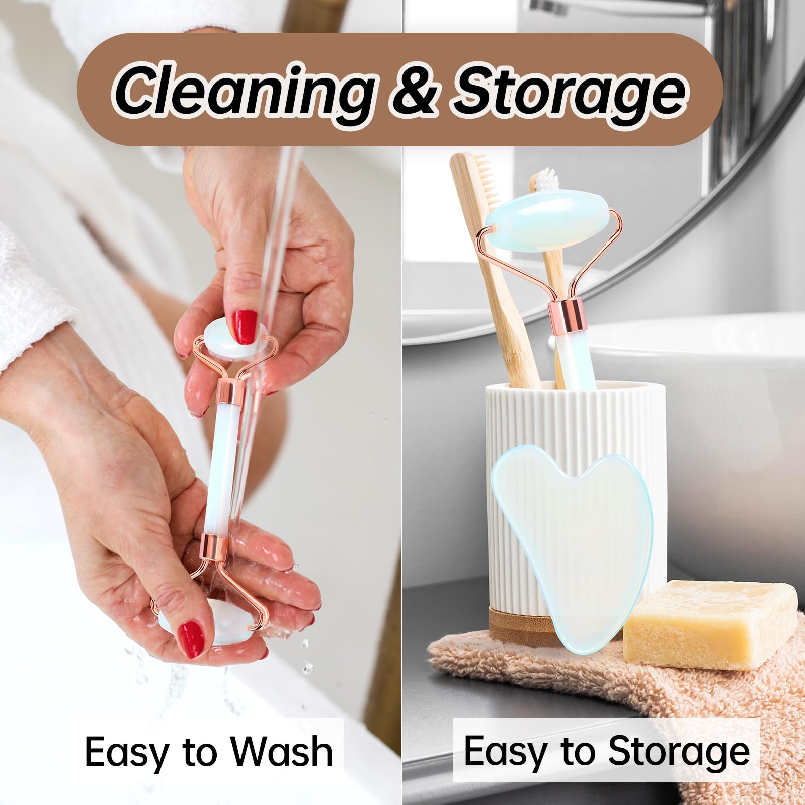 Olaemuo Opal Gua Sha and Face Roller, Real Jade Gua-Sha Stone Facial Tools Set for Reduce Puffiness, Body Guasha Tool for Relieve Neck Tension, SinkCare Beauty Massager as Present for Women,Opal