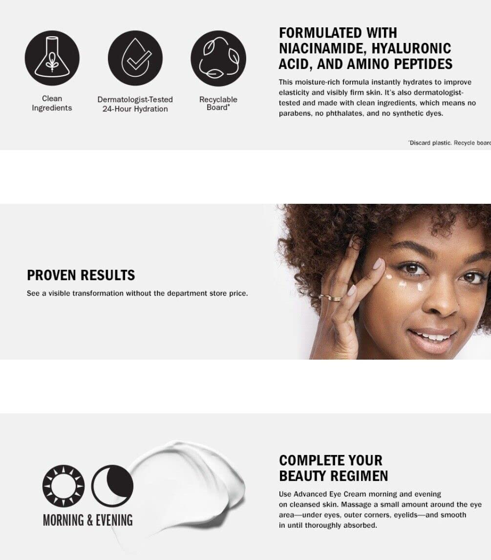 Details: Refresh your look with Olay Advanced Eye Regenerating Eye Complex! This powerful eye cream provides instant results to help visibly improve deep wrinkles, crow's feet, sagging, uneven texture, and moisture loss. It's made with clean ingredients like no parabens, phthalates, or synthetic dyes plus dermatologist tested 24-hour hydration. Use morning and evenings on cleansed skin for best results and be sure to avoid direct contact with your eyes. Put the power of Olay in your skincare routine today and get ready to look years younger!