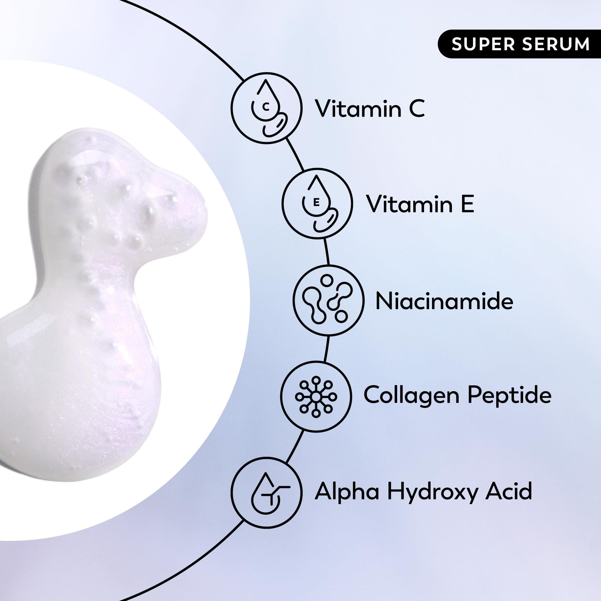 - SUPERCHARGED SERUM FORMULA: The serum is packed with Niacinamide, Vitamin C, Collagen Peptide, Vitamin E, and Alpha Hydroxy Acid (AHA) to enhance skin texture, even tone, and provide long-lasting hydration.