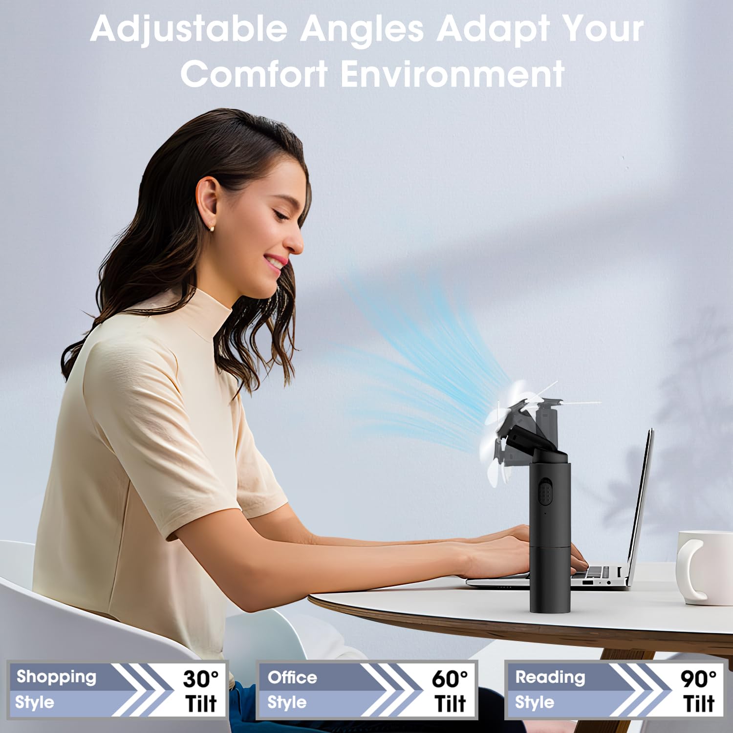 - 【More Blades,Strong Wind】It is our upgraded version portable handheld fan and different with others. It had 3 pieces silicone blades will increase 30% more strong surrounding cool airflows to keep you in a comfortable environment.30°- 90°adjustable wind direction angles satisfy your needs anywhere.Stable and durable,not easily change wind direction.