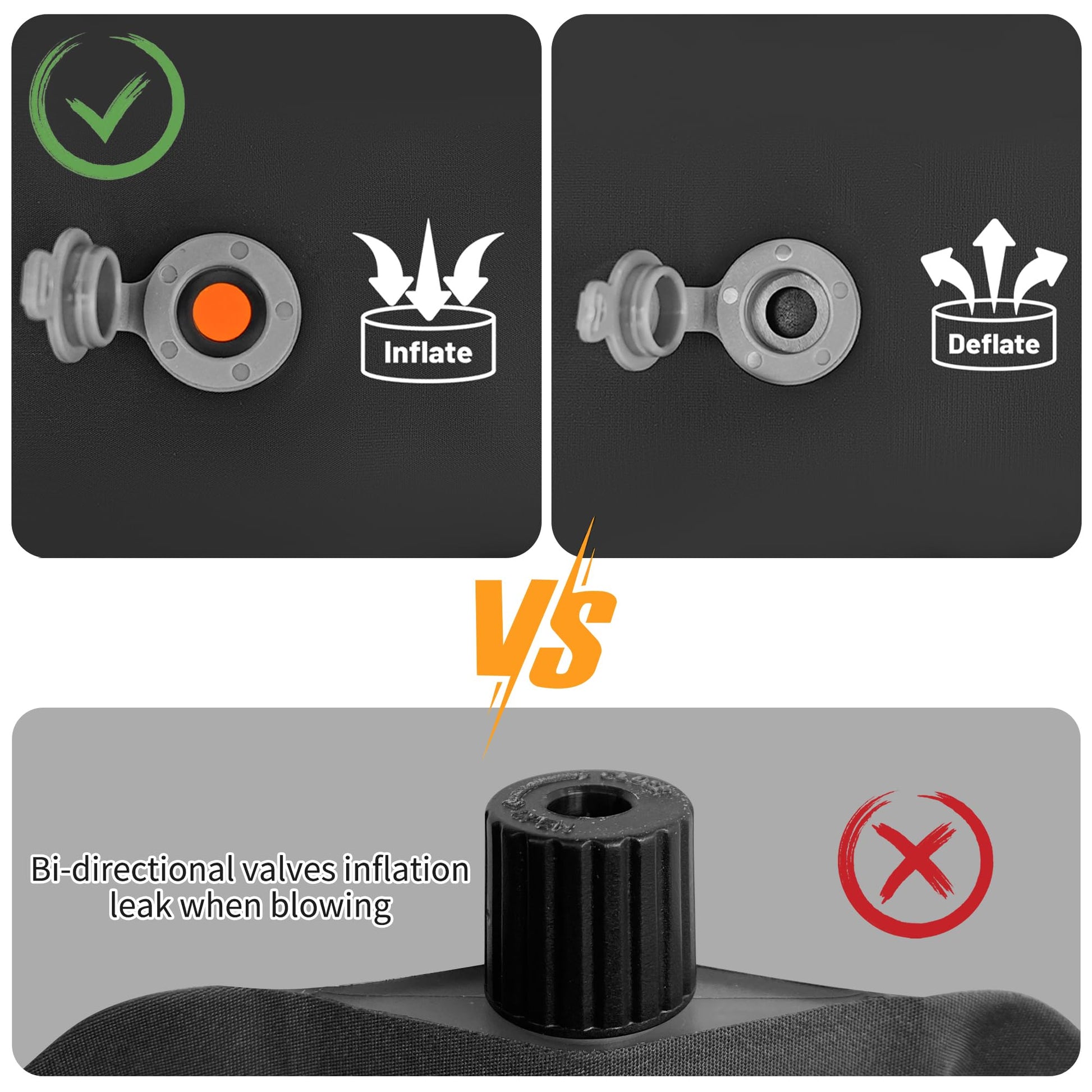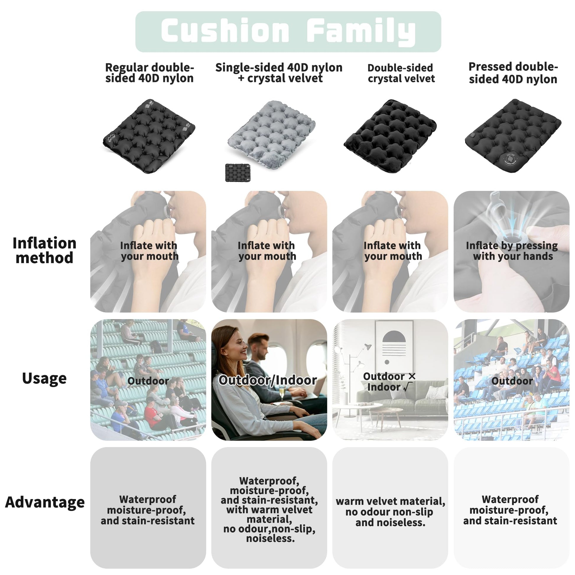 - How to Inflate: The inflation and deflation holes are separate (marked on the cushion). Compared with similar products, our air nozzle is installed on the top, which is cleaner and more hygienic. Normal people can inflate the cushion once, while older people can easily inflate it three times. (If you want inflatable camping chair with backrest you can search ONTYZZ to purchase)