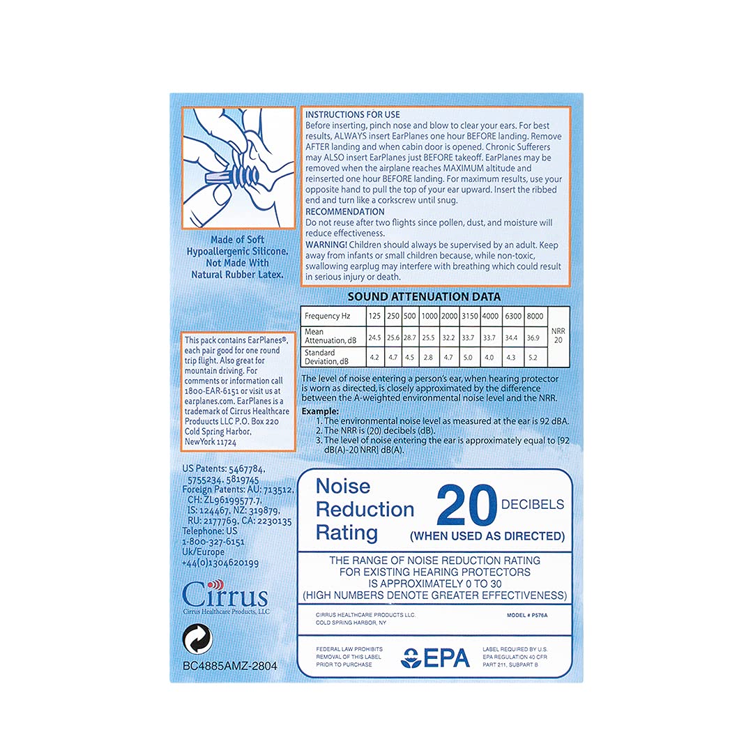 Details: -World’s #1 Seller for preventing ear pain inflight! -Children’s size will also fit adults with small ears. -CeramX technology protects your middle ear from rapid changes in air pressure -Made with soft, hypoallergenic silicone. RECOMMENDED USE -Insert EarPlanes prior to take-off -Feel free to remove EarPlanes at cruising altitude -Re-insert EarPlanes 45 minutes prior to landing -For best results, replace after 1 round trip Inside every EarPlanes earplug is a small ceramic filter. During take-off and landing of a flight the CeramX filter slows the shift of air pressure that enters your ear. This more gradual change in air pressure exerts less stress on the eardrum, reducing overall ear discomfort. With ear pain on airplanes, wear EarPlanes!