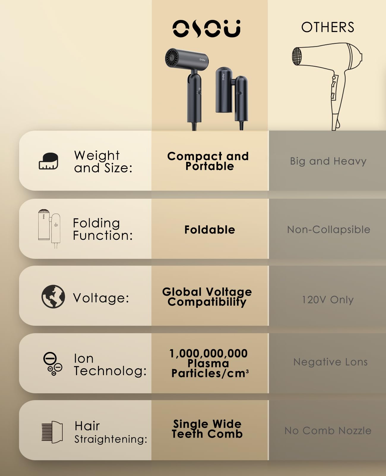 - 【Global Voltage with Auto-Sensing】This mini hair blow dryer is designed for international travelers! Just plug it into a local adapter, and the hair dryer will automatically sense and adjust to the local voltage (100V-240V). No extra buttons to press or settings to adjust. It's designed to make your travel experience hassle-free, no matter where you go.